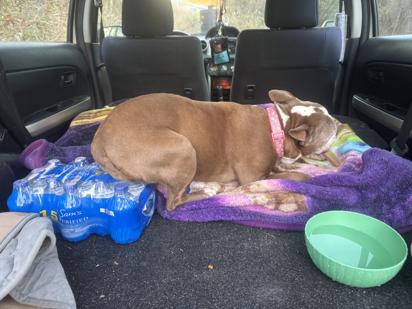 Shania Twain is a red nose pit bully. She’s kind of brownish and white with gold eyes. She is a good nature dog and she’s very calm