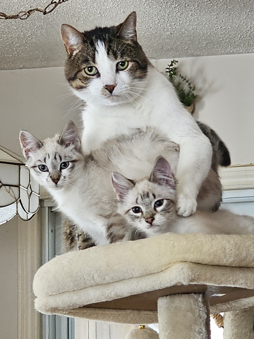 Please meet Mister Shitten. He is the boss of the house as you probably tell by his pose and he also keeps watching over two kittens.