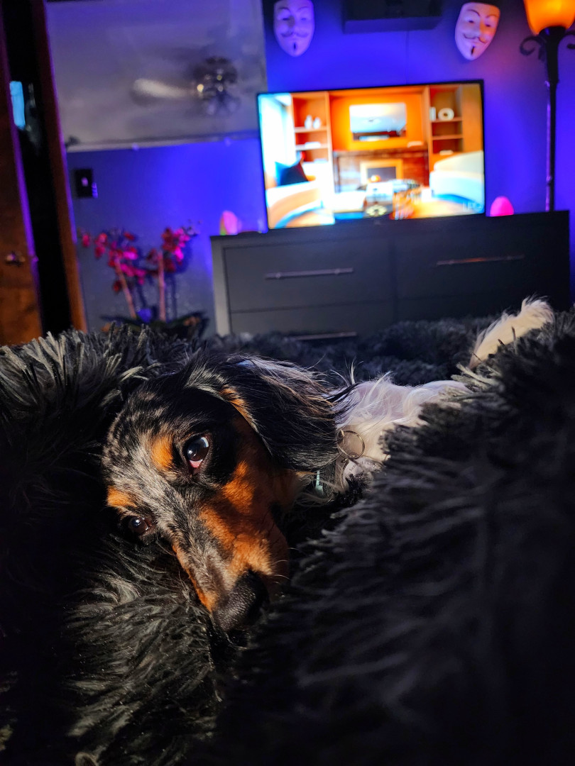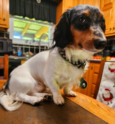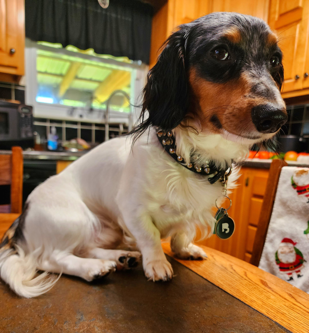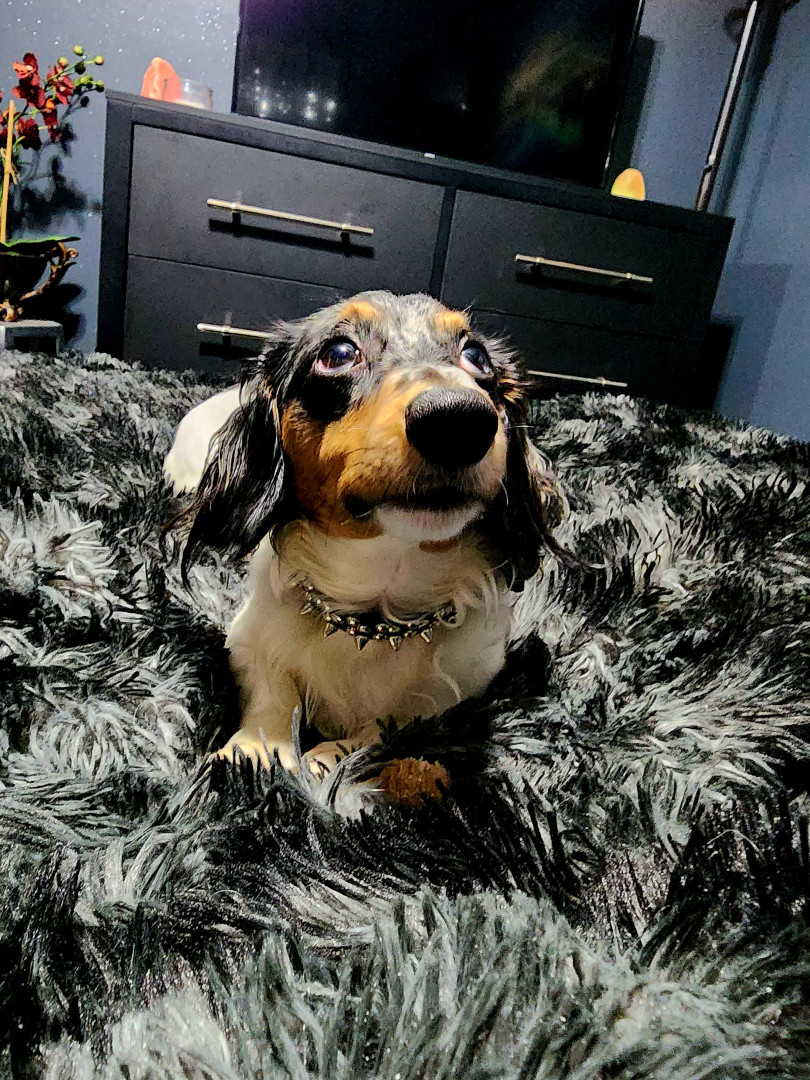 4yr old piebald long haired dachshund. Loving playful and a little grumpy close to bed time. Loves riding shotgun in daddy's Jeep