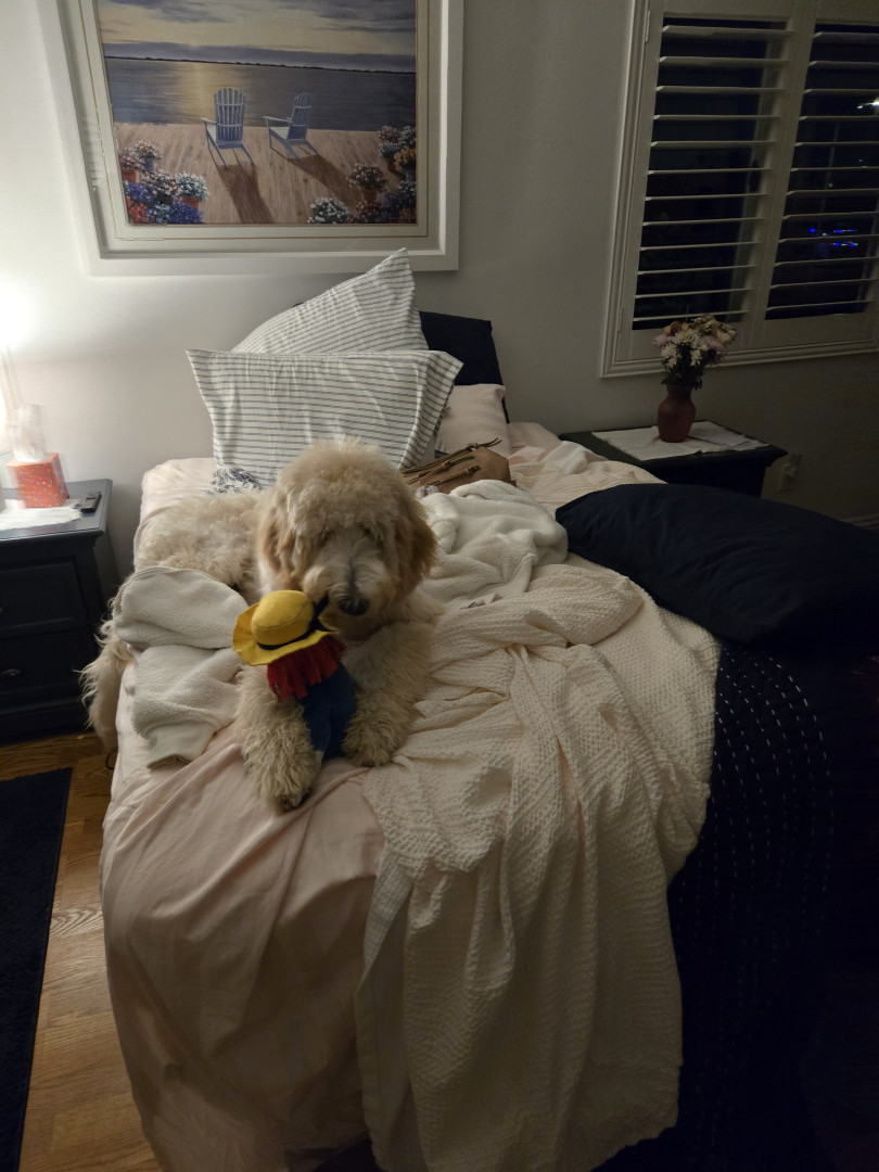 Loves to go around the house with his squeaky toys. Wants loves. He drinks his water out of faucet for his water.