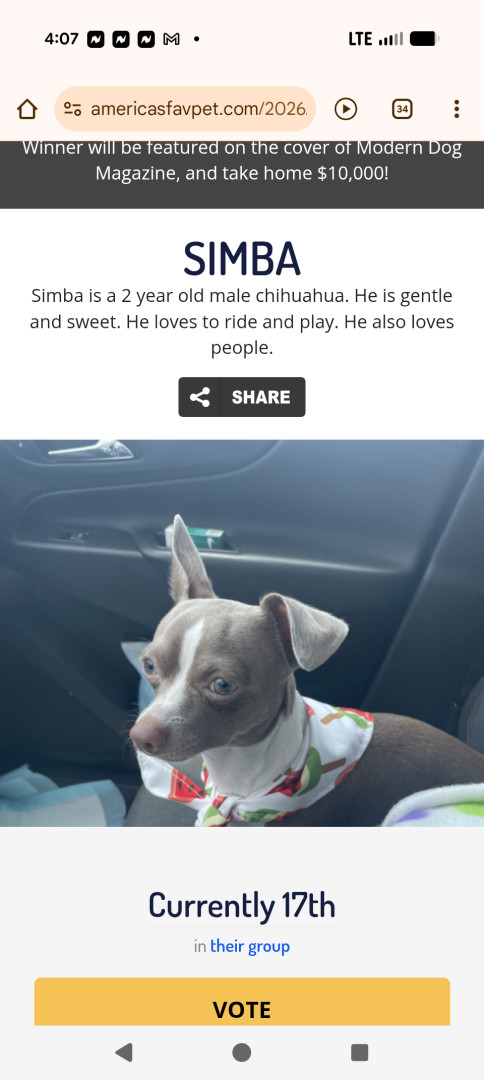 Vote for Simba Francis to be America's Favorite Pet with a tax-deductible donation supporting PAWS.org in their mission to help sick, injured, and orphaned animals.