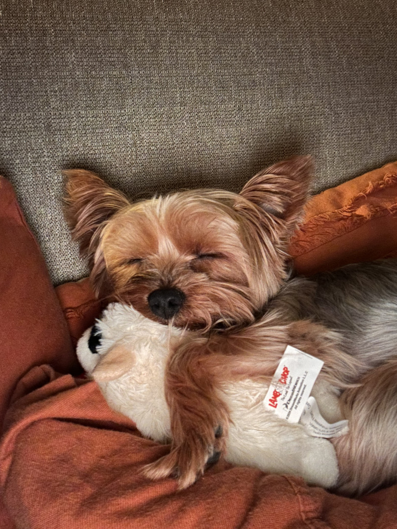 Simon has many toys but he loves playing with his squeaky hedgehog . He also loves his occasional pup cup from Starbucks.