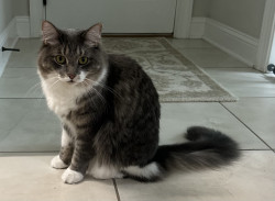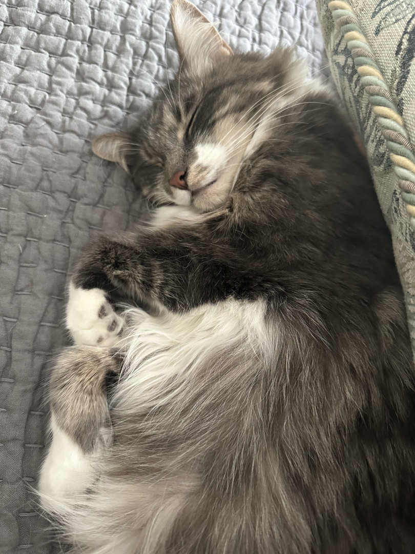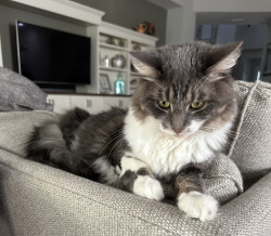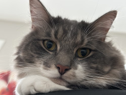 A sweet lovey inquisitive bundle of grey soft fluffiness, who likes to snuggle, play and give kisses.