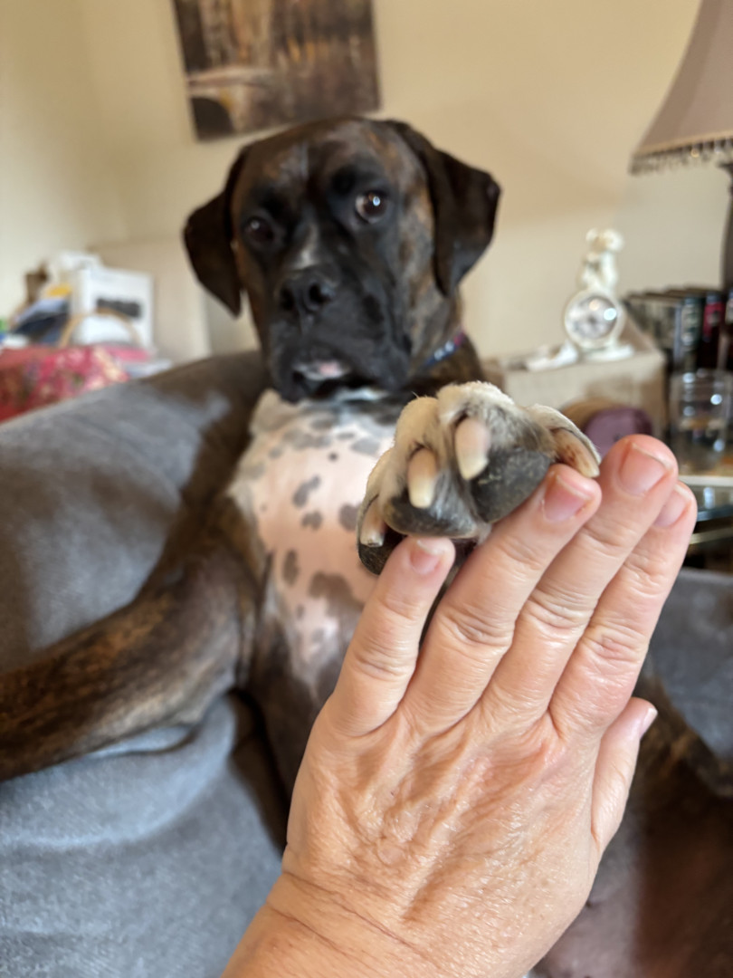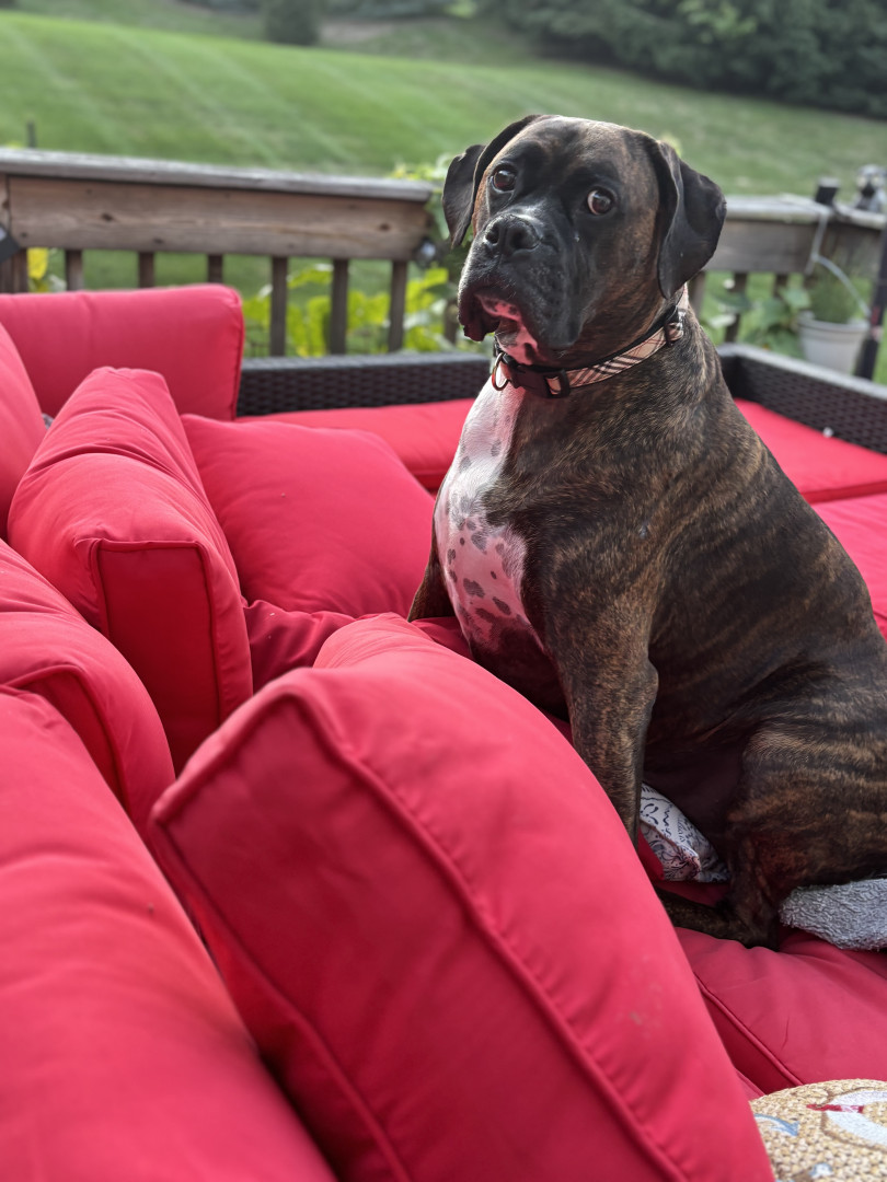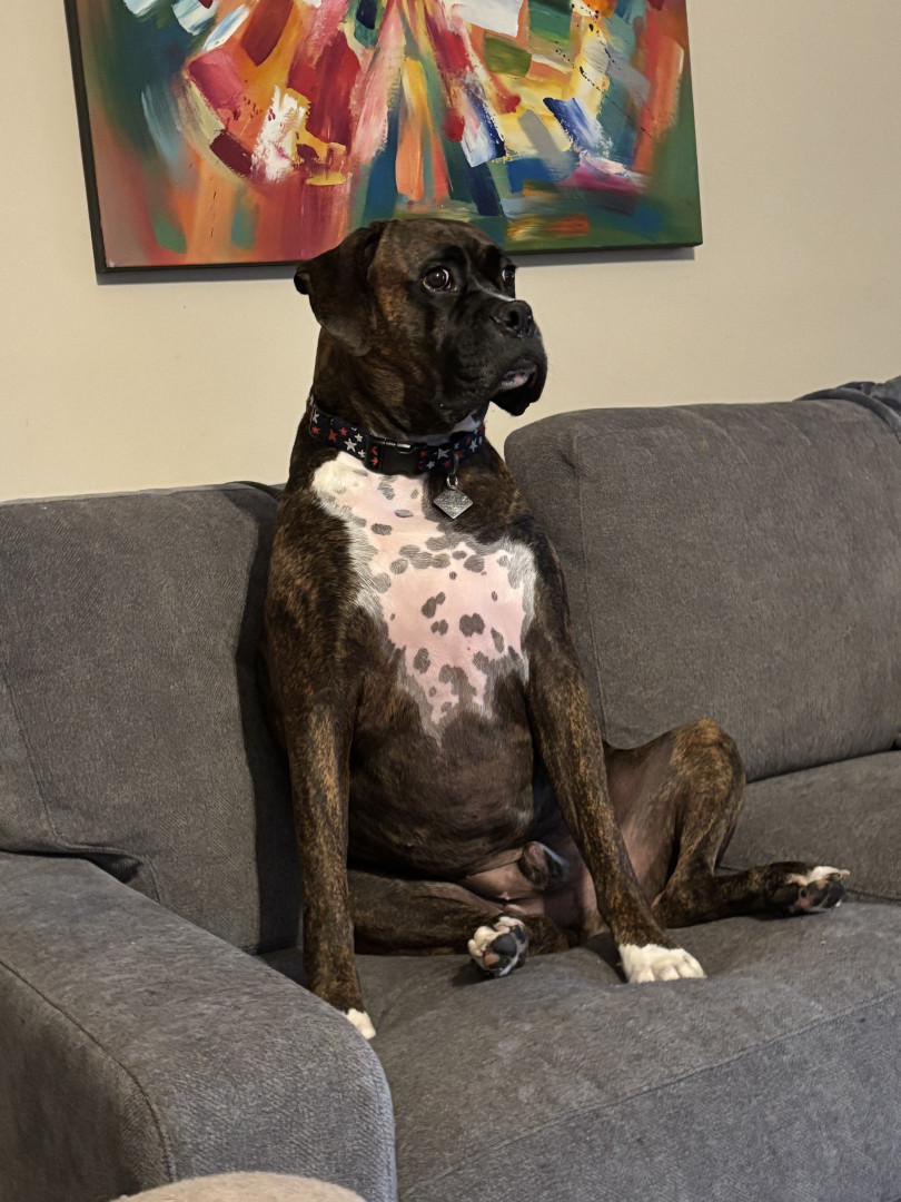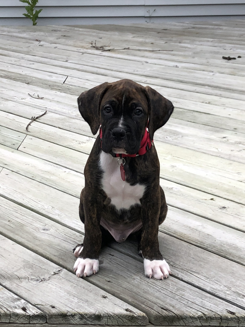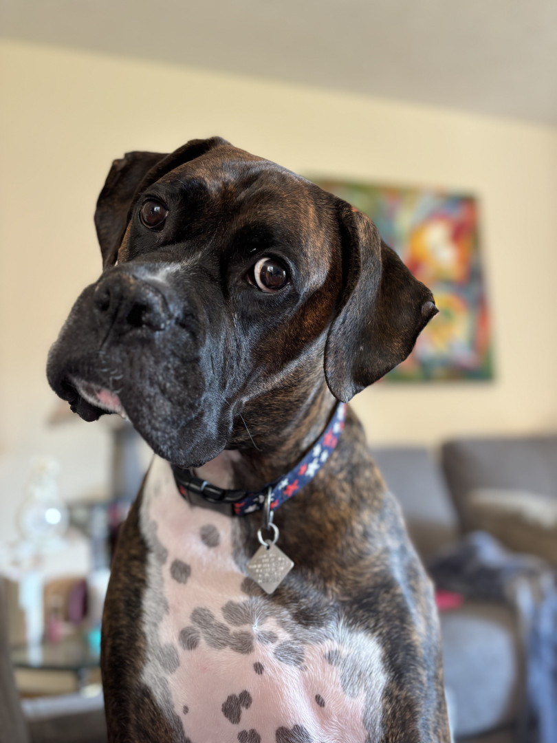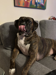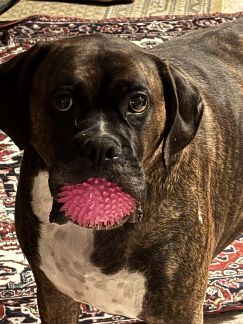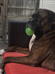 Big-smart-lovable Boxer boy, loves frisbee, closes the door behind him when he comes in from yard. Gives the best hugs
