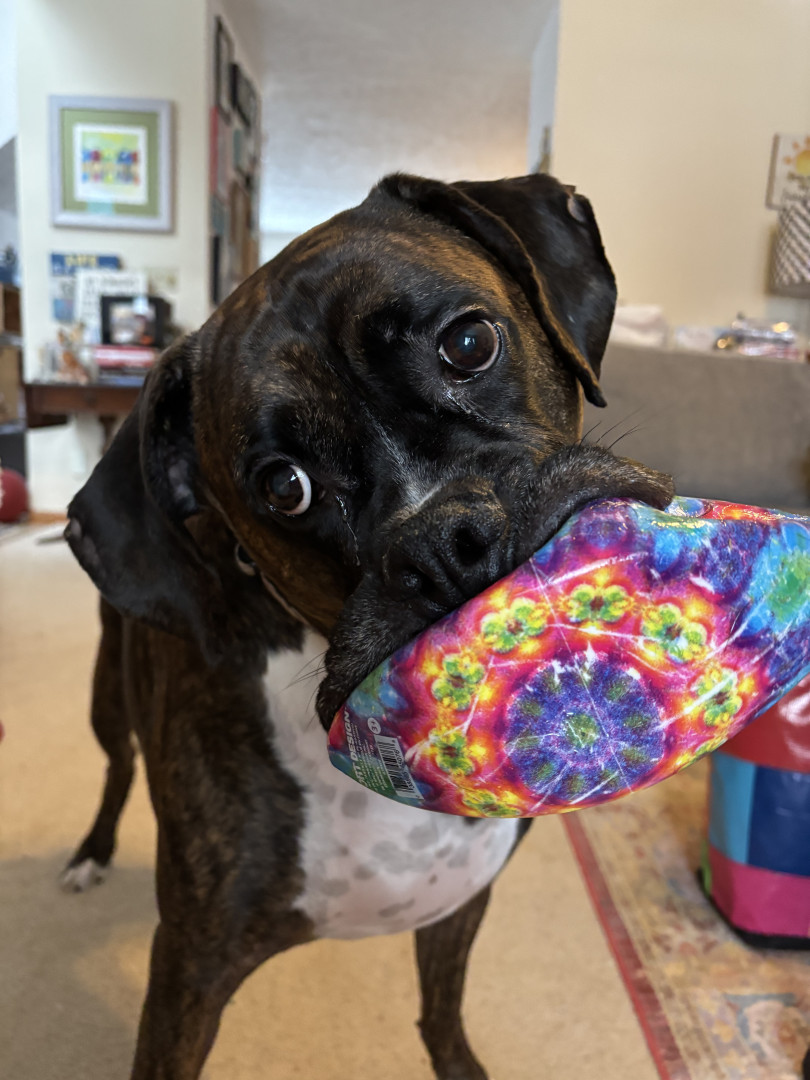 He is a giant sweet lovable bull in a china shoppe, wiggle butt Boxer boy, I call him my muscle. He is the smartest dog I’ve ever had. He was part of a rescue litter and I got lucky and got him. He is strong loyal protective and above all funny. Wish I could attach his ball or door video from Instagram see @docboxcar for videos
