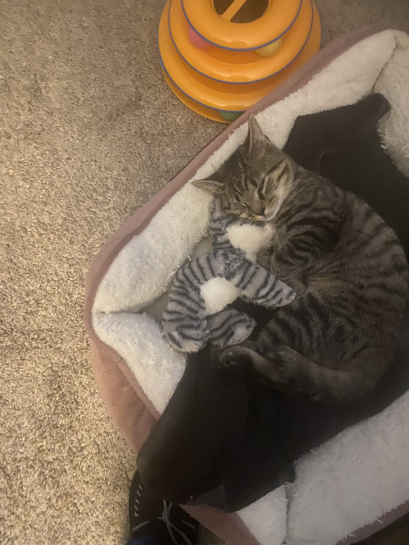 He loves to play fetch! I am a remote worker. Even when on a call he will drop his current fav fetch item on my chest. If I can’t respond he simply curls up on my lap, or foot. He knows, of course, I will toss it for him when I can.
