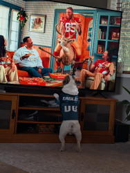 Loves to watch the Eukanuba dog show and loves the Philadelphia eagles especially when they score. He surely knows when they get a touchdown he has to put his jersey on for game day. Ohh..loves watching the wizard of oz 🤣 it's his absolute favorite 🍿 movie