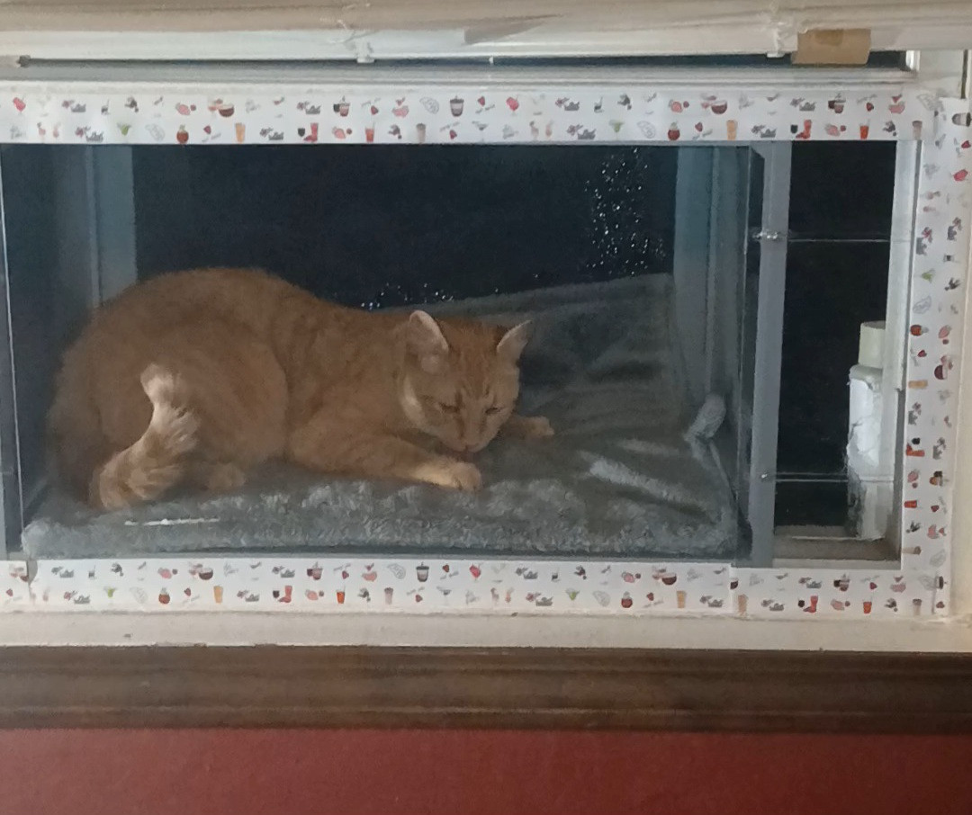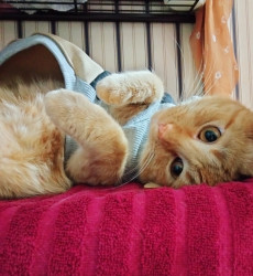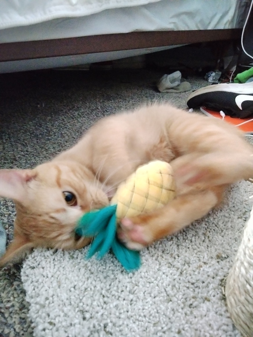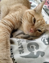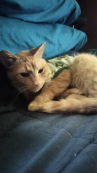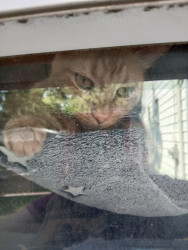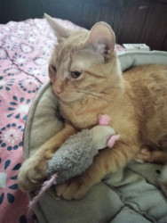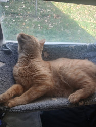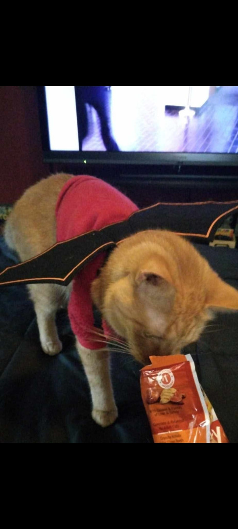 Nacho's favorite toy is either a stuffed pickle that says "I'm a big dill", or his own tail. He's very picky about the kind of treats he'll eat. He has to lick each treat first to see if he likes the flavor. He also loves his window hammock and outdoor cat window!