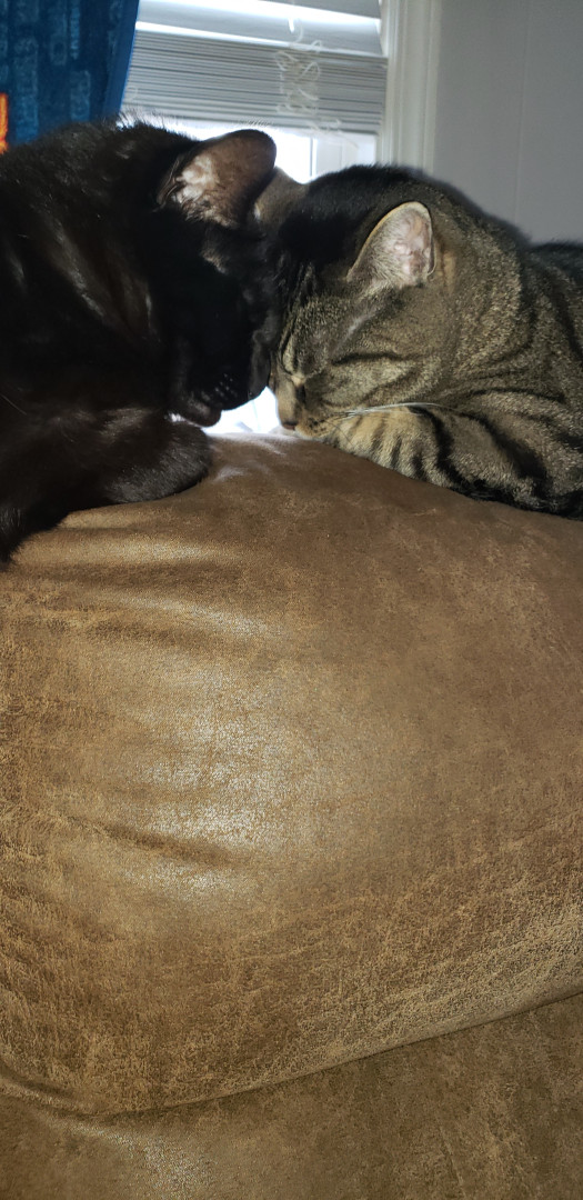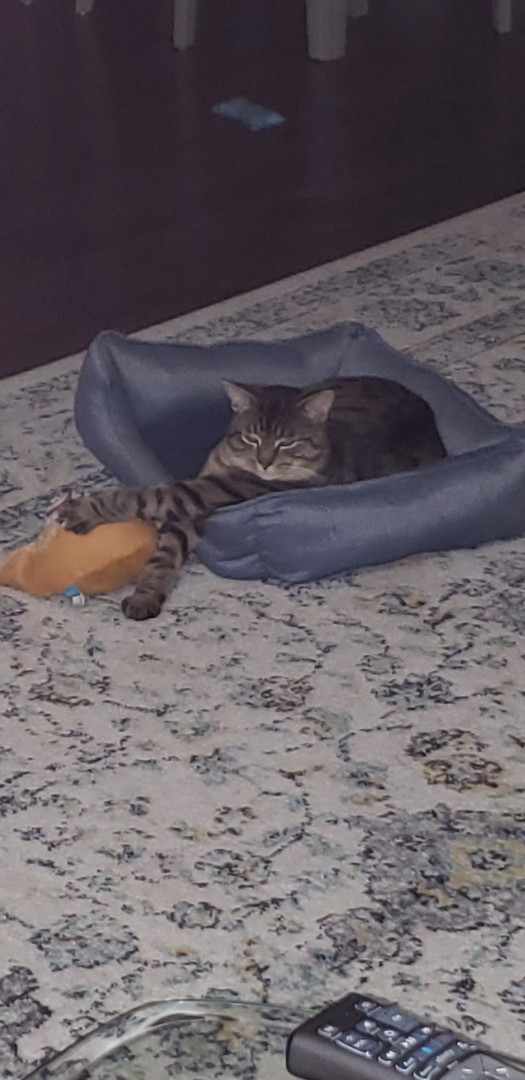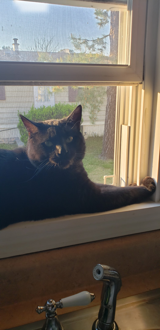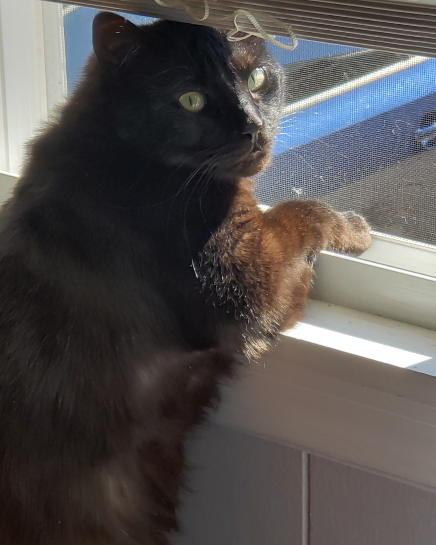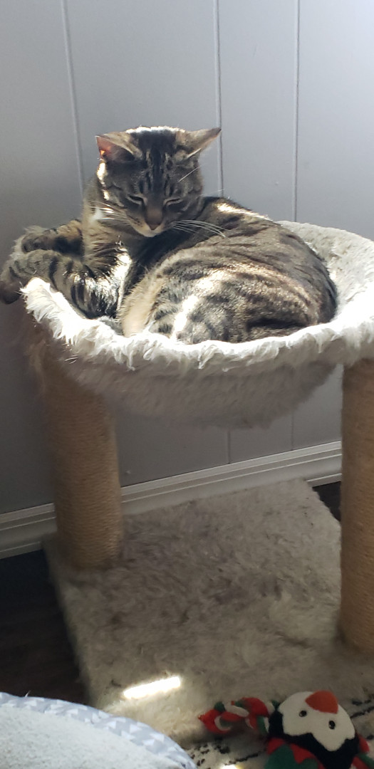 SLICK loves to watch out the front window and loves his scratch post and his bed with his brother BAGHEERA