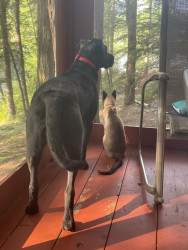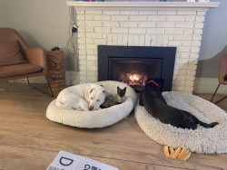 Slinky adores her dog siblings and rules with kindness and cuddles rather than catitude. It’s pretty funny to see her after a tongue bath from the doggies!