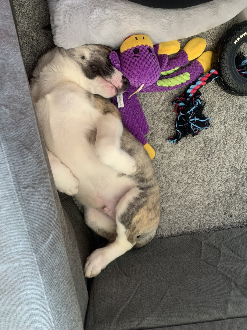 A hard rubber football and plush toys, also any meat treat