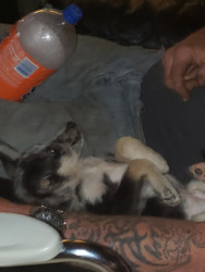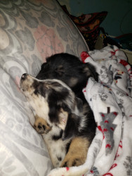He is a cute little Australian Shephard puppy. He has a half brother, Bandit, whi ch is in one of the photos. He loves popcorn.