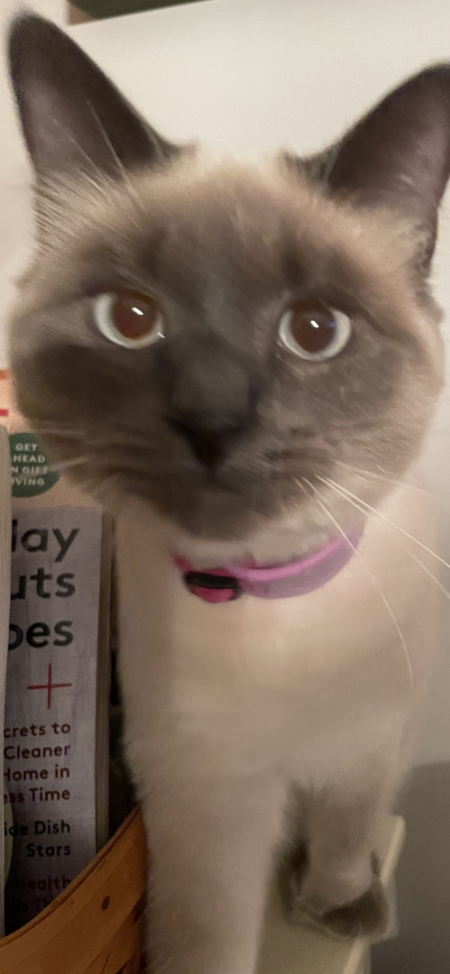 Smokey is an adorable, high energy feline, who loves life and her family! She loves to entertain anyone willing to watch her act.