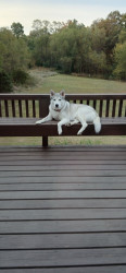 He howls at me from the house every day when I come home from work. He is a very playful husky and he will sit up a want you to hold his paws will you scratch the back of his legs.