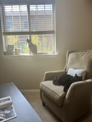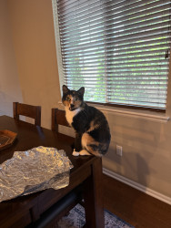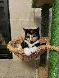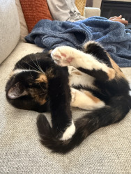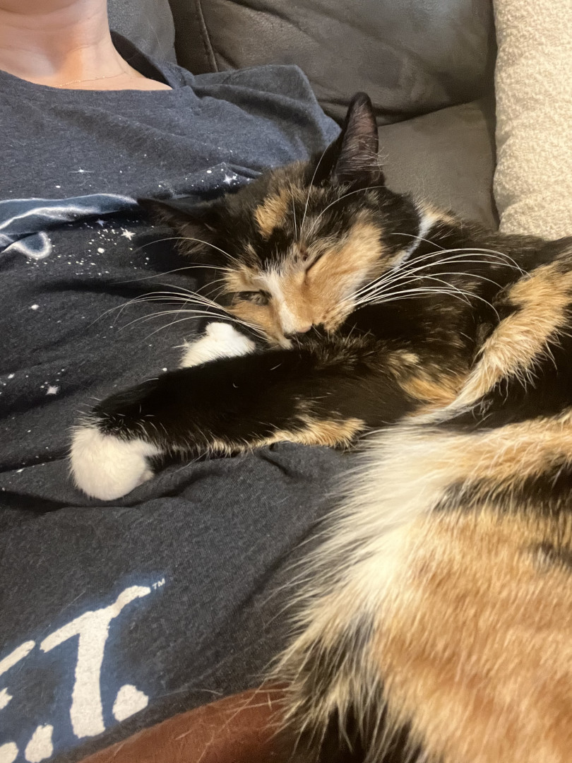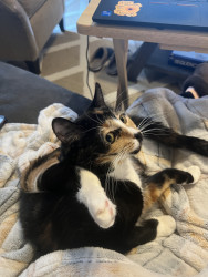 She is loving, but very shy with strangers, a real scare-dy cat! She loves her big sister, and loves to cuddle & get into odd predicaments!