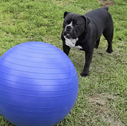 A bully stick and favorite toy is a big yoga ball