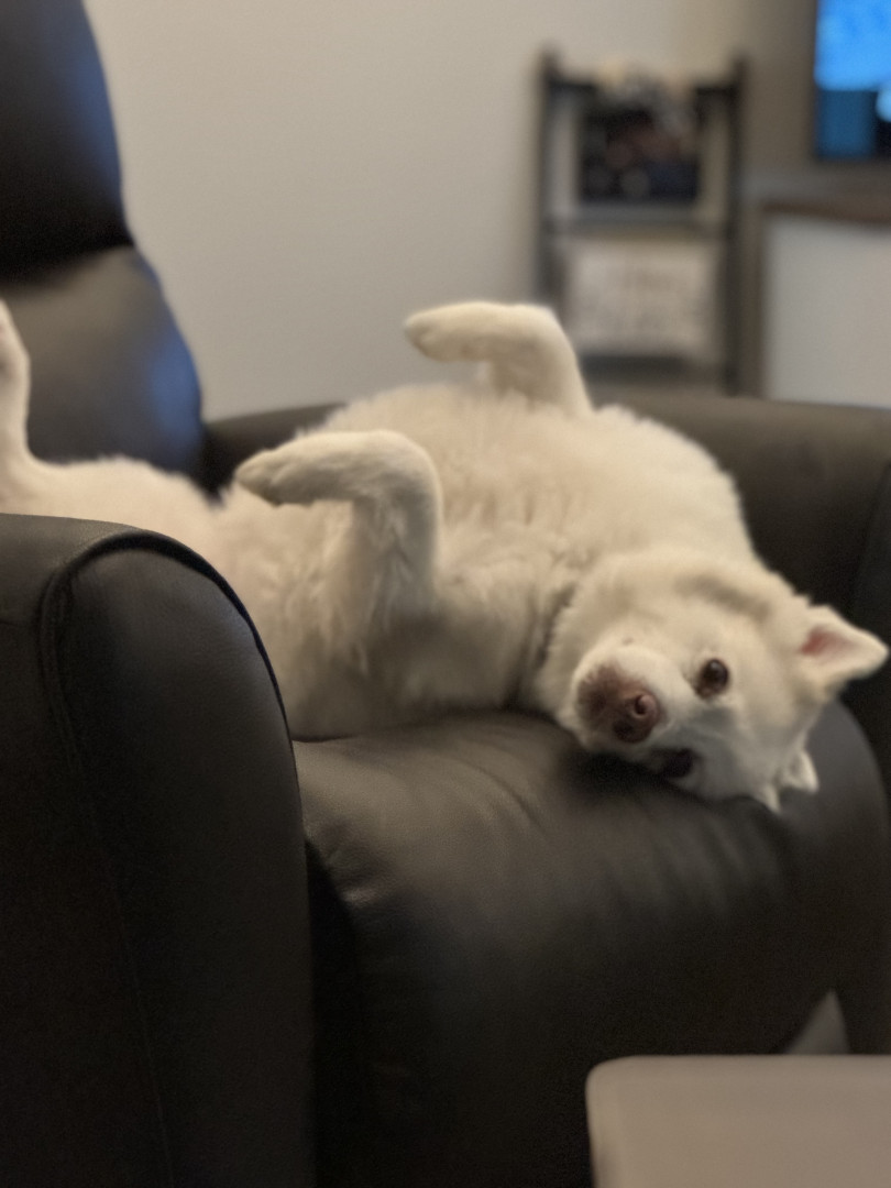 Snowball has a lot of unique traits - it’s really hard to pick! She thinks she needs to have a treat anytime her daddy comes in from outside; she hears me cooking and opening a bag of shredded cheese, she comes RUNNING. She’s not a fan of being held unless you’re holding her like a baby. If you found THE SPOT she likes when you scratch her she holds your hand with a death grip with her paws. She really doesn’t bark unless there’s a UPS truck driving by - she goes nuts!