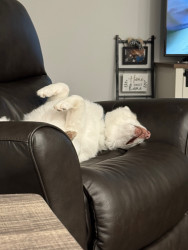 Snowball is very much a mama’s girl and loves unconditional. Loves cheese and wants to be petted on if she’s on your lap!