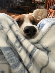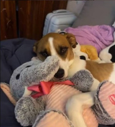 A male he is a golden retriever lab mix he loves to play outside he’s white and has brown spots he gets along with other dogs very well.