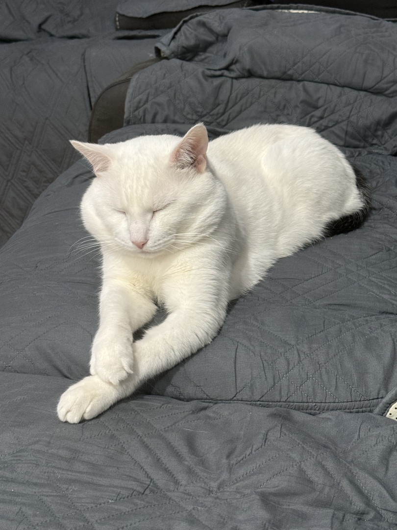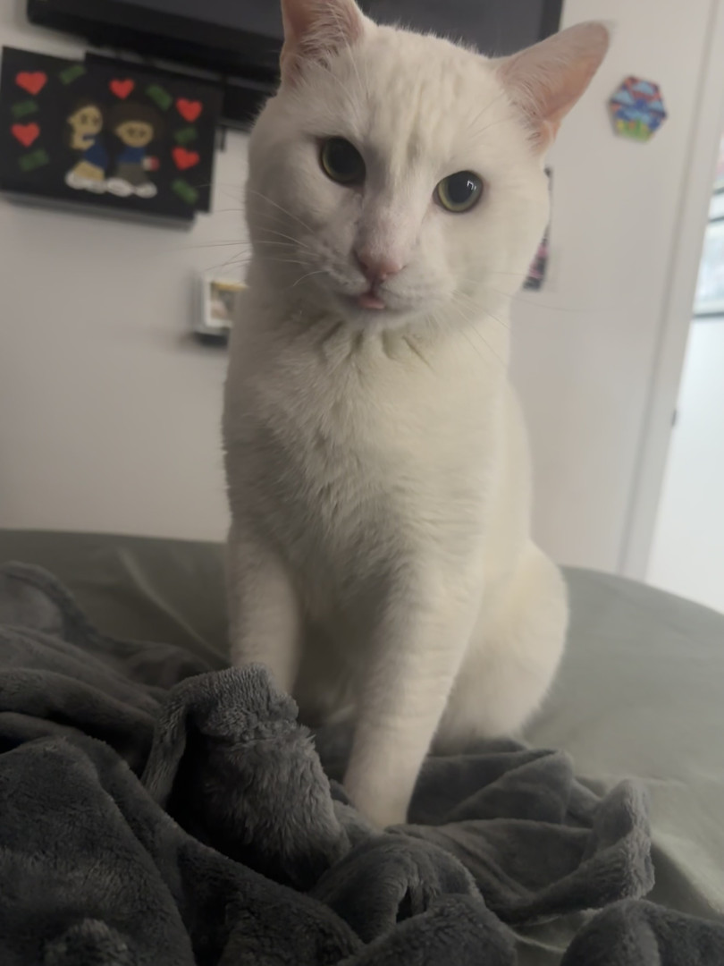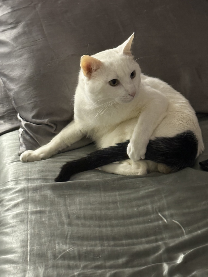 Snowball most unique quality is his color. He is all white with a black tail. He has a bad attitude. He will roll his eyes and totally ignore you. He is very smart, sassy and has a lot of expressive body language. He just makes you laugh all day.