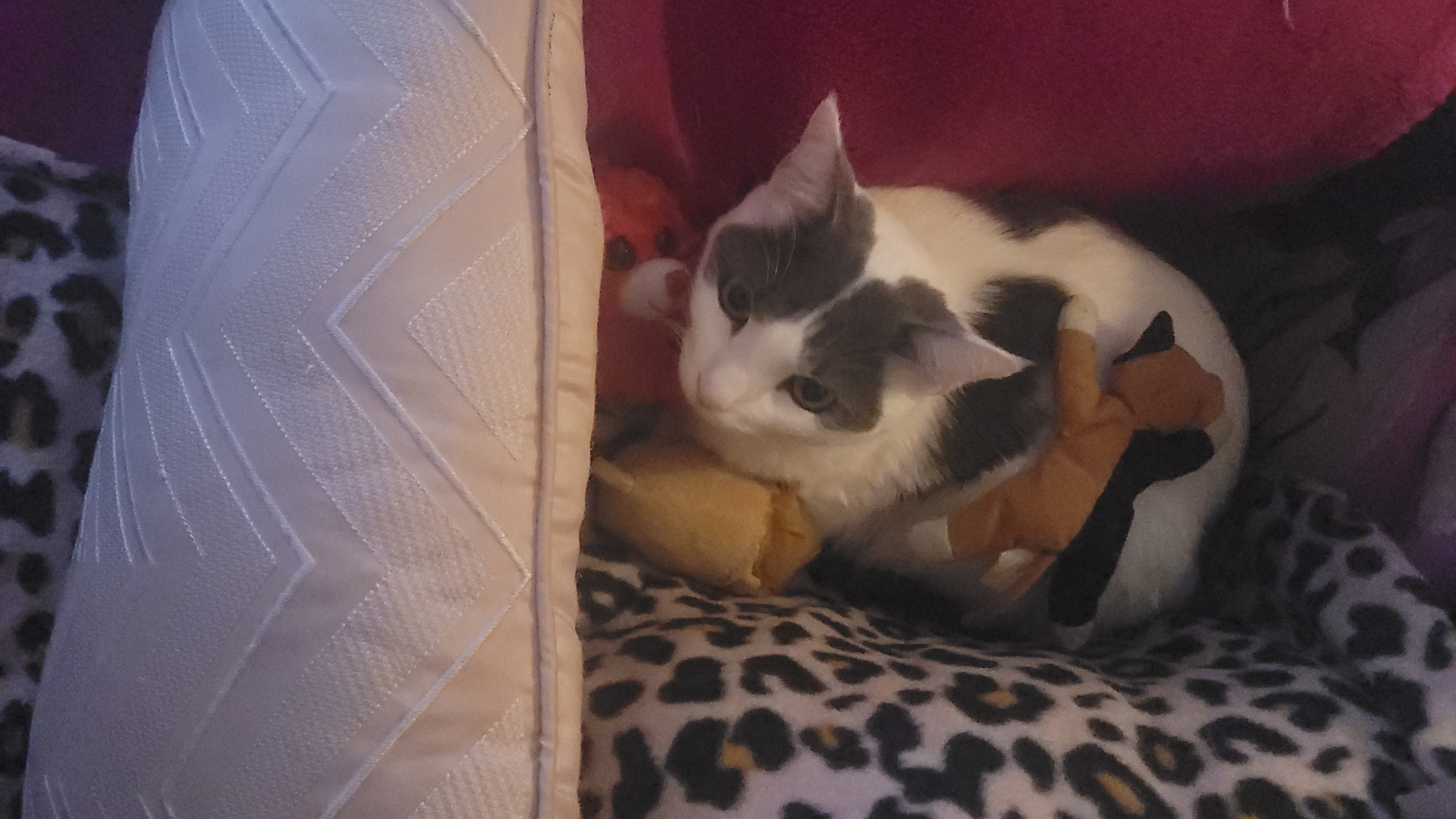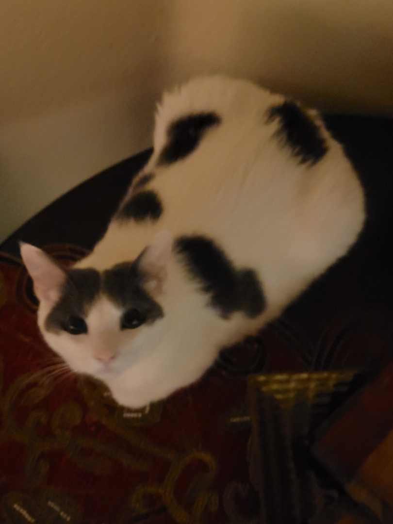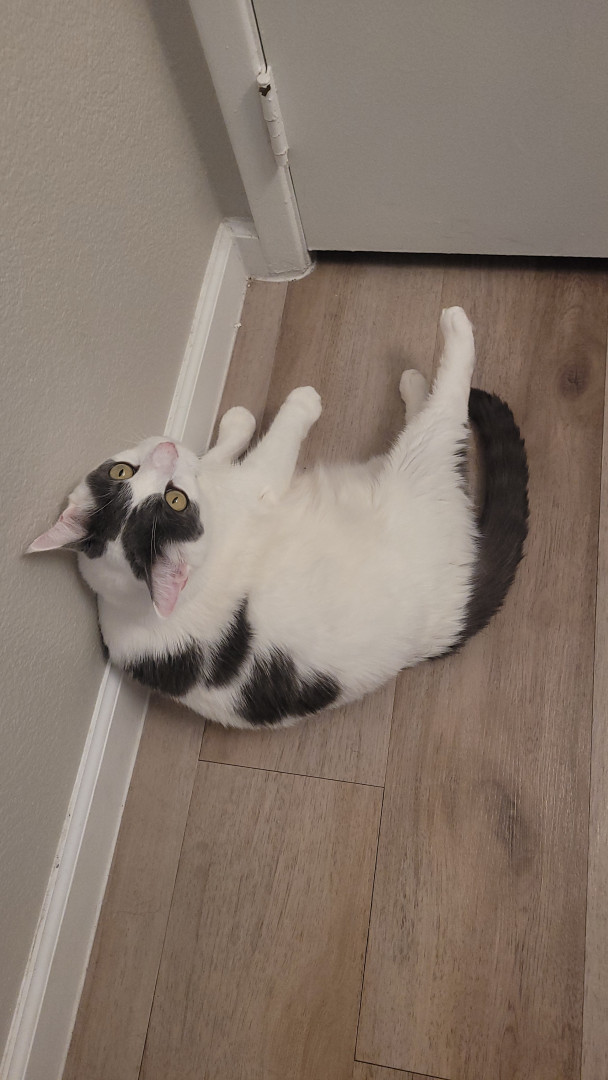 She likes to bark and chirp. Snowy is not your average kitten. She barks open the bathroom door like a tiny guard dog, sleeps glued to my side, and cuddles like it’s her full-time job. She grooms me for a solid twenty minutes, yawns while letting out the cutest little cry, and absolutely talks back when she’s told what to do. Tell her not to run outside and suddenly she’s auditioning for the Olympics. She chirps, she pounces on people’s feet for no reason, and she’s ridiculously friendly.