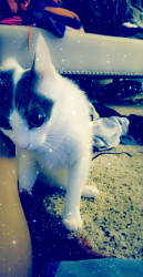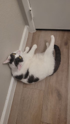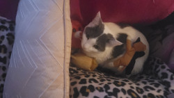 Her favorite go-to is those creamy chicken churros. Her favorite toys are anything that moves that she can pounce on, including her other cat sister.
