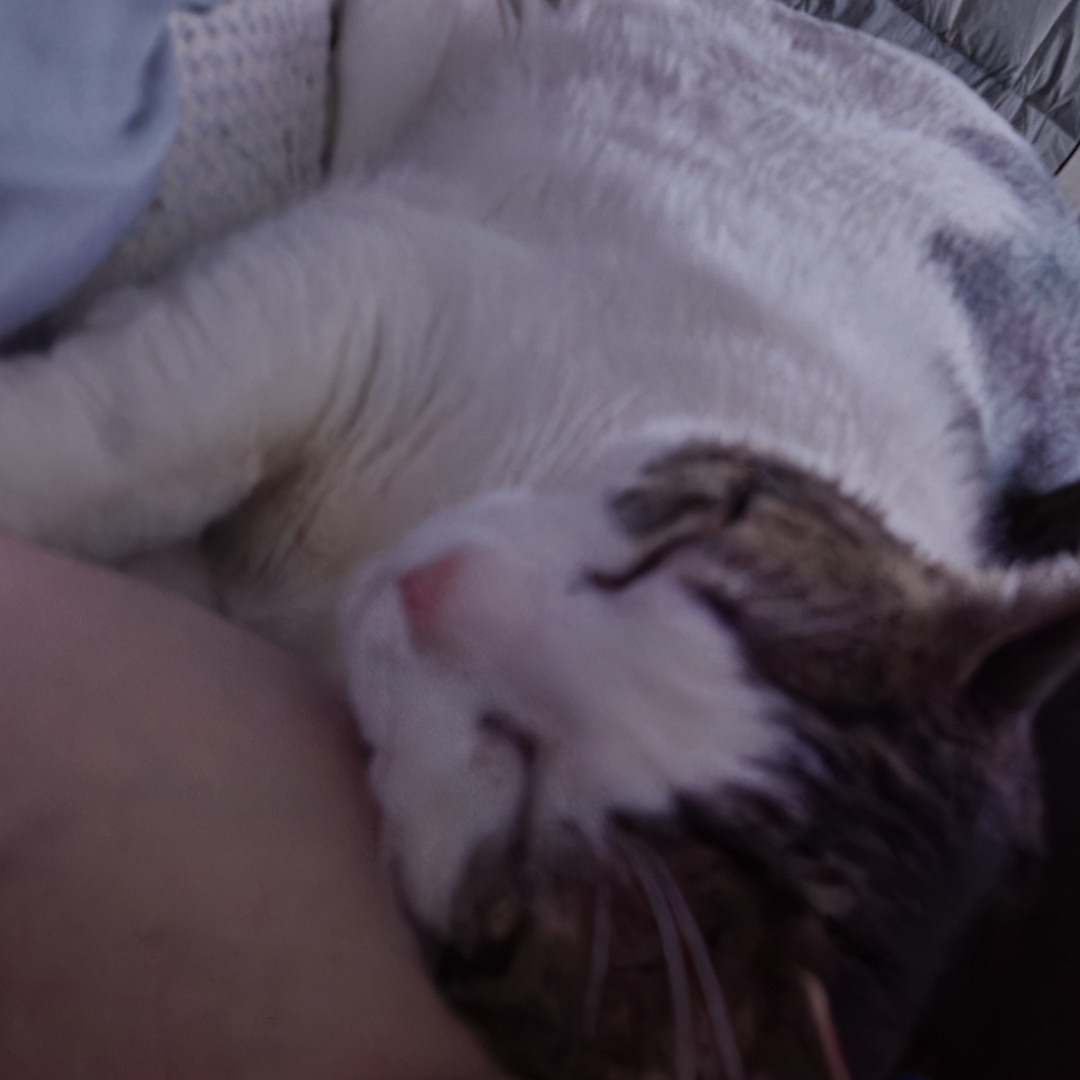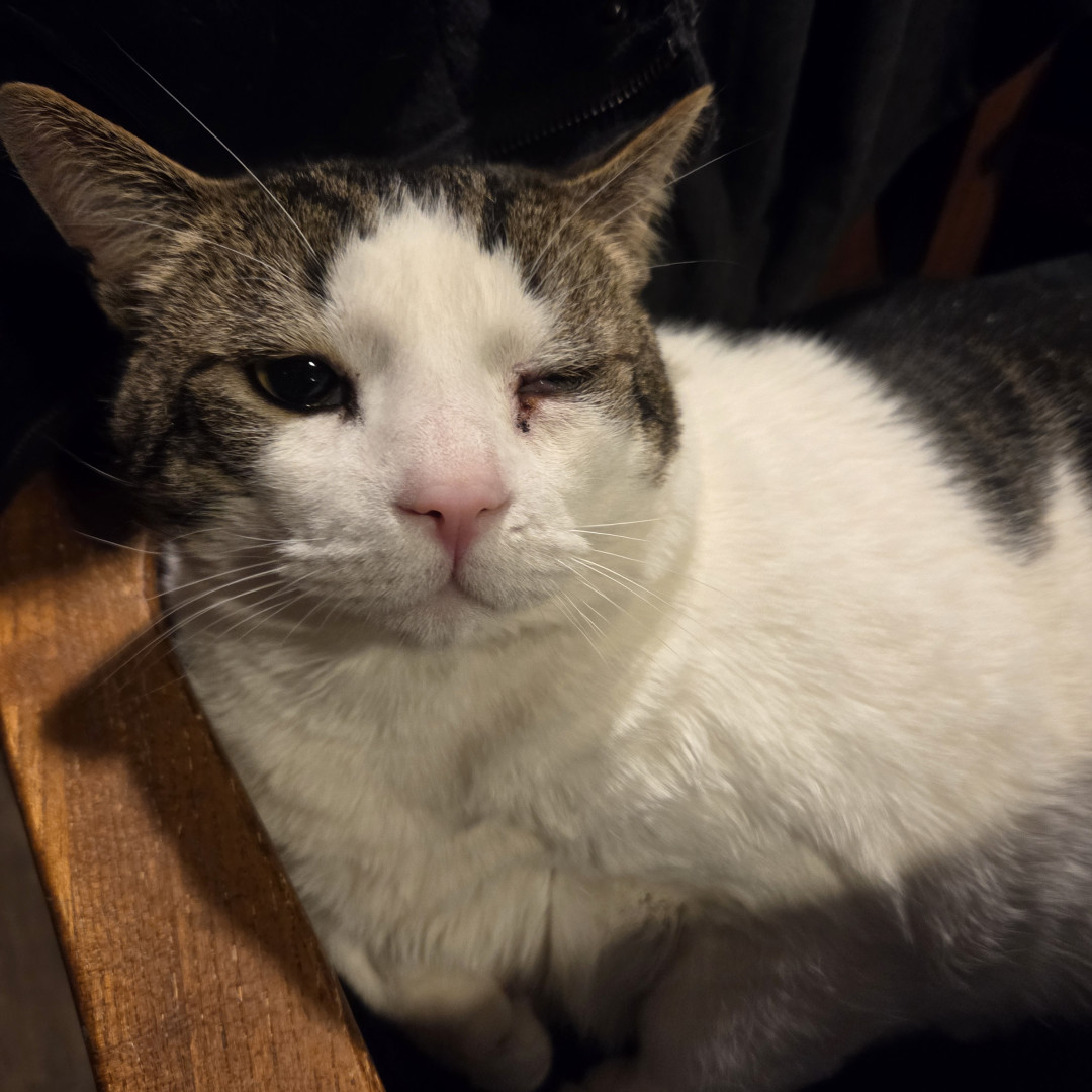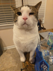 Snowy I am sure is similar to alot of walk in the door rescues. He made such a memorable impact when he literally walked in our front door. He needed help and he is so full of love that we can't imagine what we would do without him. We named him Snowy because of the weather he went through to get to our doorstep. He defines a cat needing help and the love he shows everyday with us, our pets, and anyone in hour home always greets them with head bumps. From feral to family member our Snowy