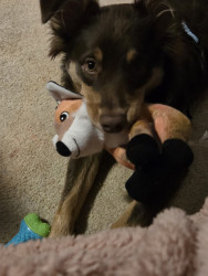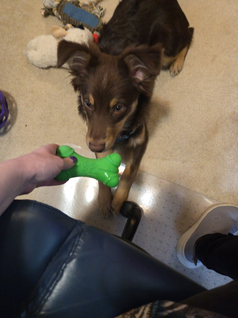 Green squeaky bone or balls in general. He loves natural peanut butter!