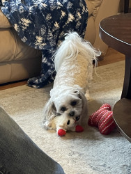 Sophie’s favorite toy is her lamb chop squeaky toy , that no longer squeaks. She’s had it since she was a puppy and we refer to it as her baby .