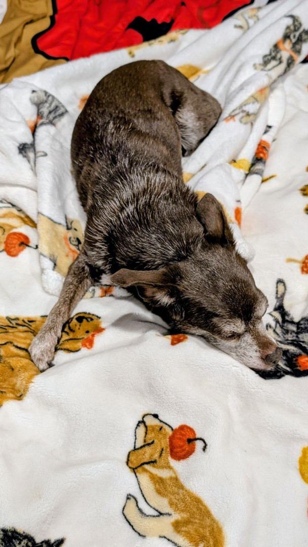 She is a 17 year old apple head, deer chihuahua. She acts like a puppy more than her 12 year old kids do. We both have separation anxiety.
