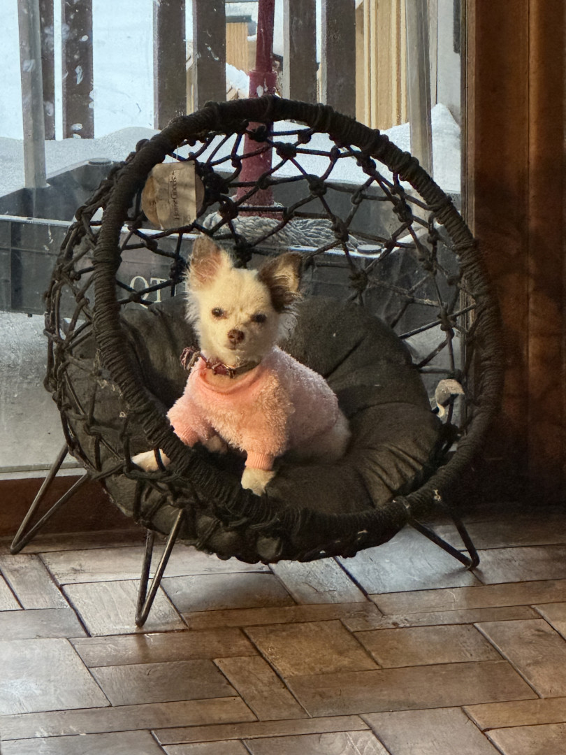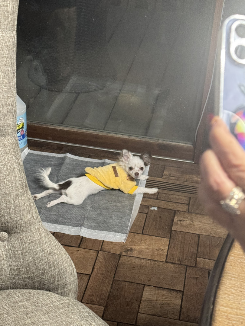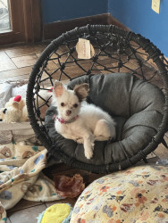 Sophie is a white long haired Chihuahua with brown spots. She is 6 months old and very active. She likes to play and can do so by herself