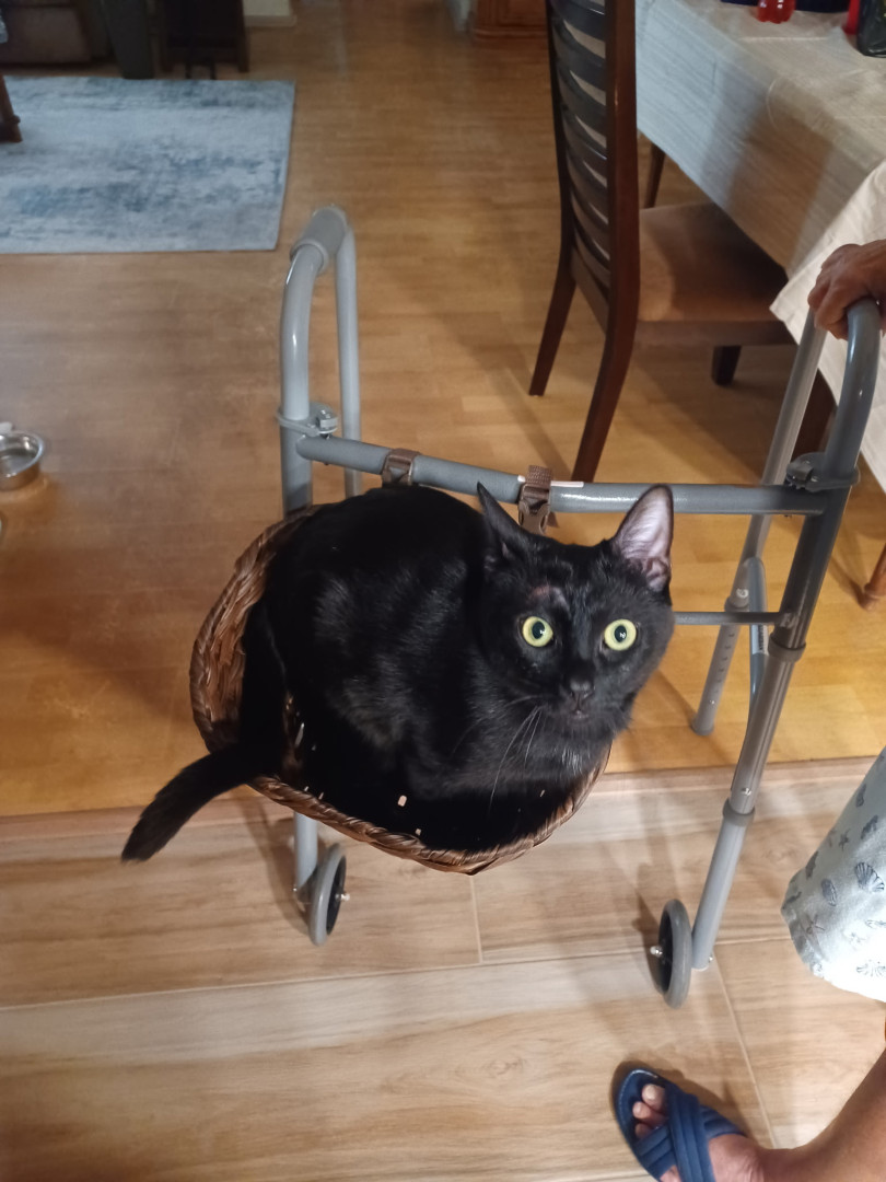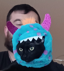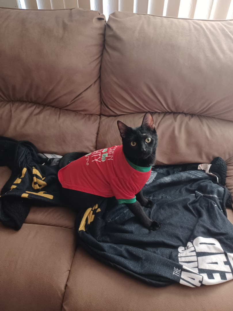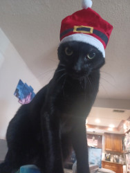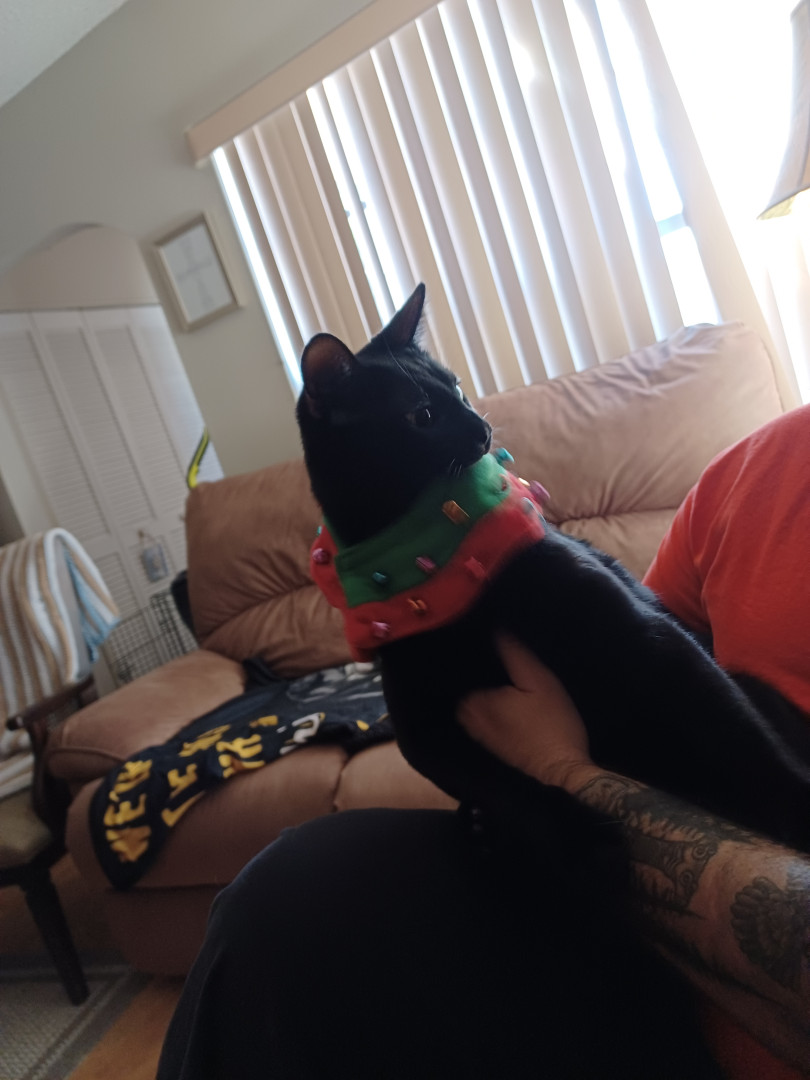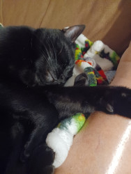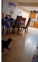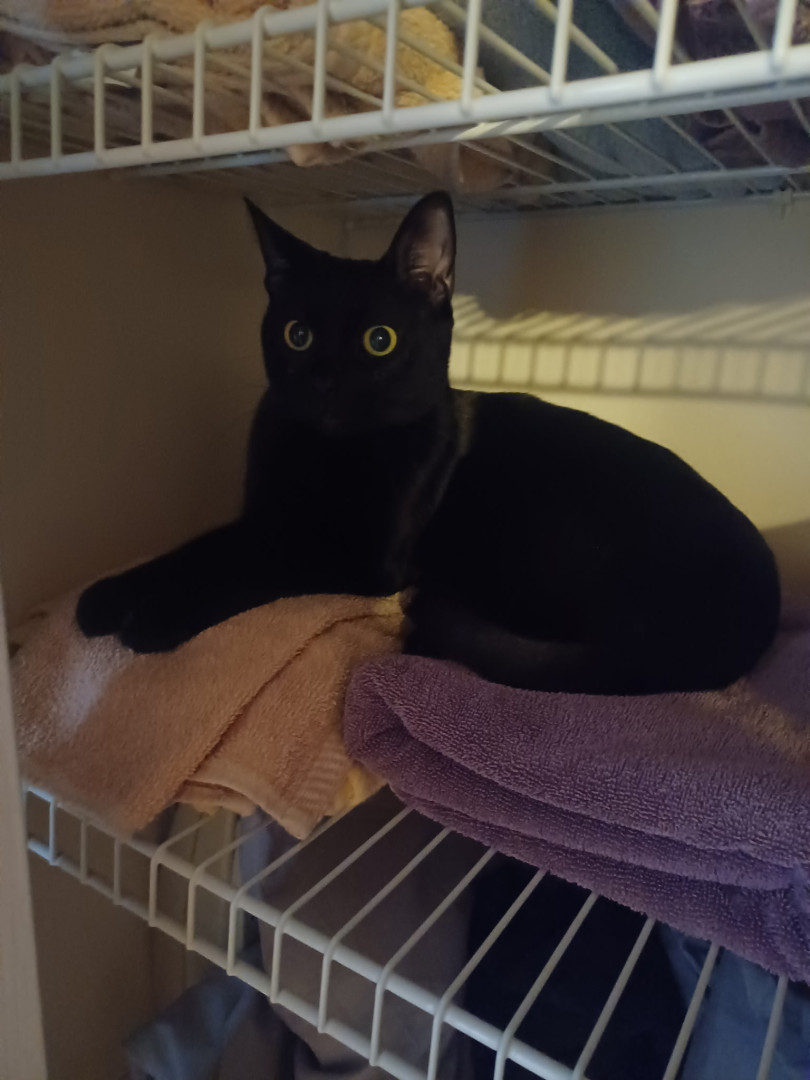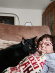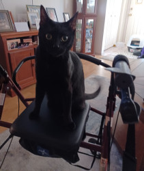 Spooky was an abandoned outside cat, who became domesticated quickly. My little goddaughter couldn't take care of him, so I welcomed him into my home. HE IS AS LOYAL AS A DOG, and has learned to fetch a ball, roll over, and play tug of war, but most of all as a senior citizen, he has given me companionship. His long black body and green eyes match his name of being Spooky. Spooky is everyones favorite cat!