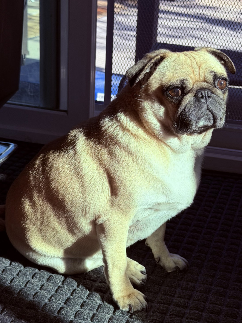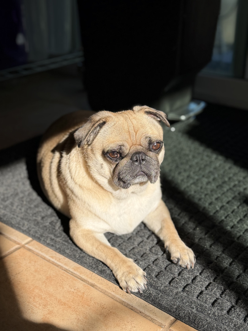 Stella the pug: tiny body, huge heart, endless snorts, sass, expert cuddles, and proof that big love comes in small, wrinkly packages.
