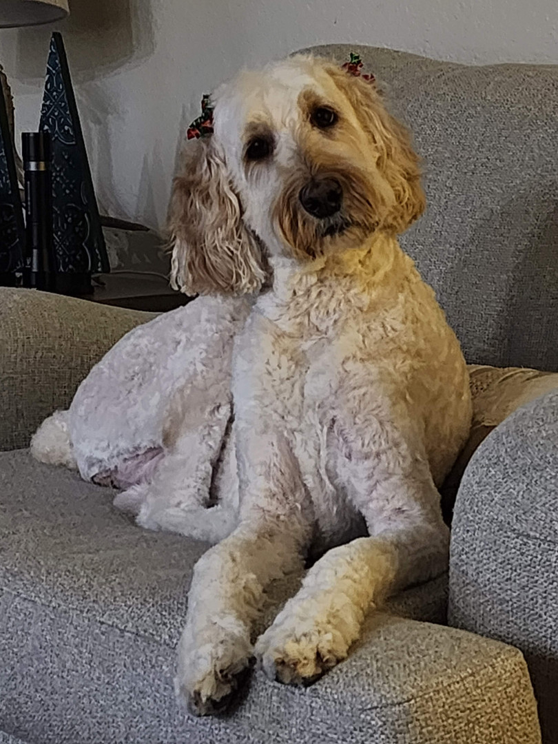 Stella: 5yo Labradoodle, 60lb snuggle bug. Fun, mischief-maker, semi-trained (she runs the show). Chris, my husband, is her person. 🐾