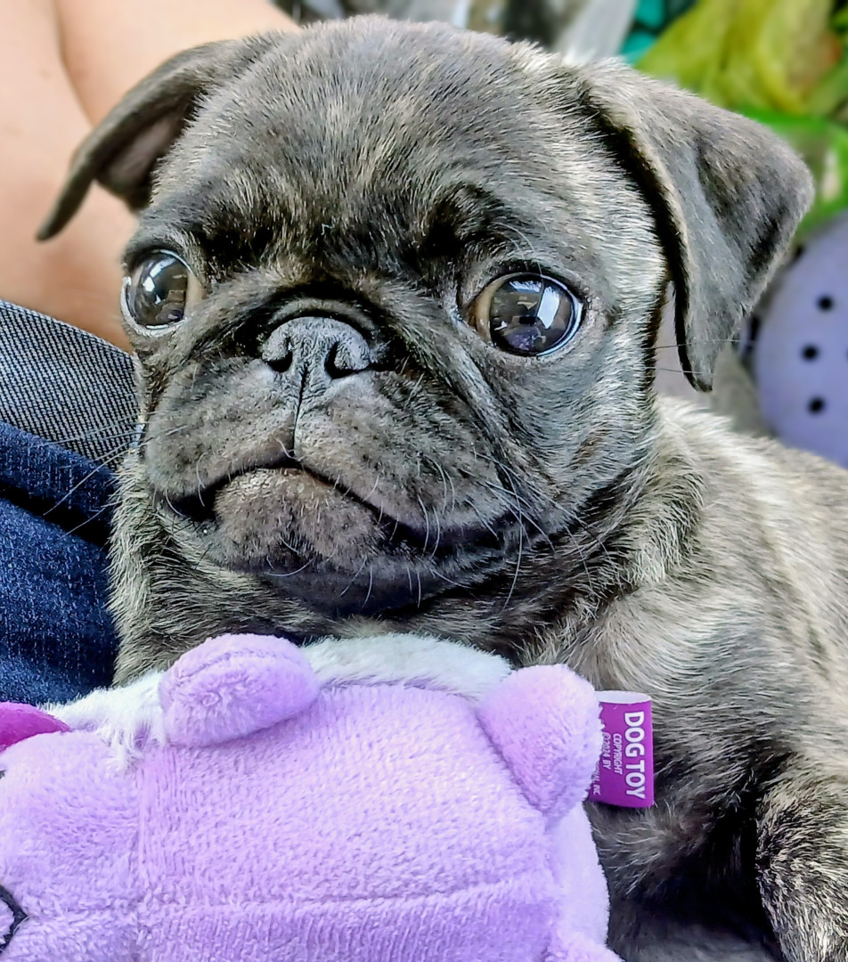 She is the sweetest little Pug ever. Loves to sleep in my arms and get attention. Pugs are the very best dogs.