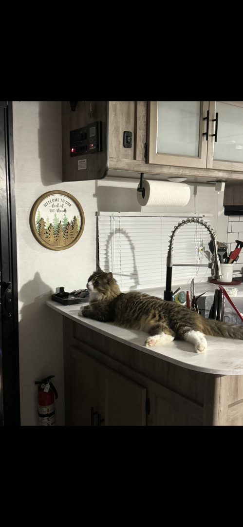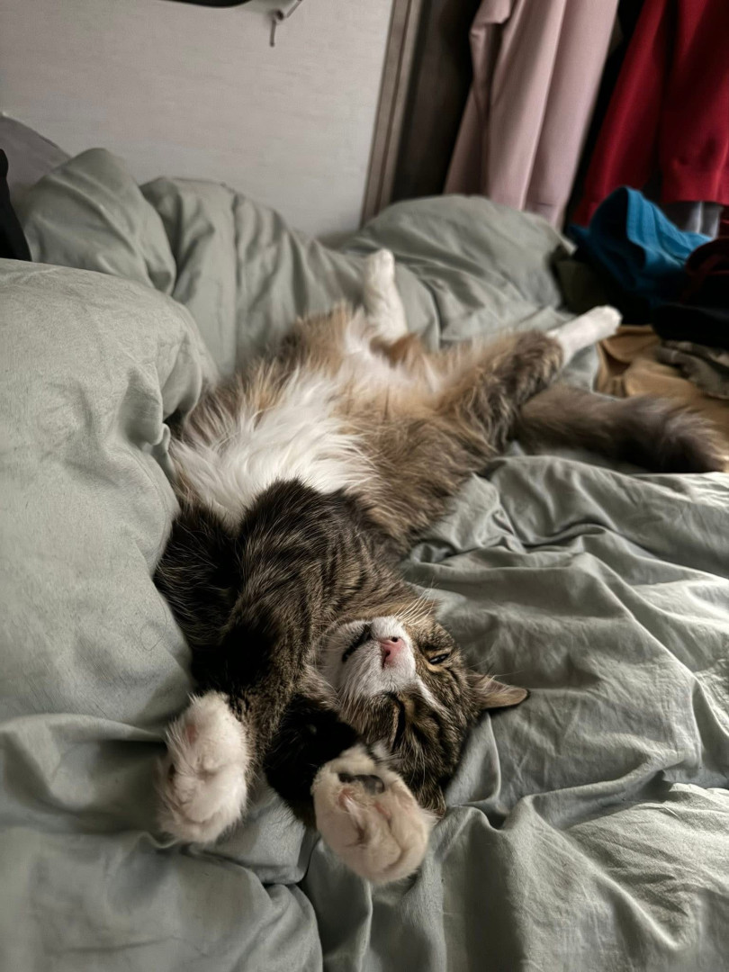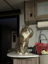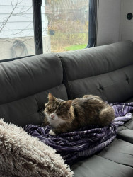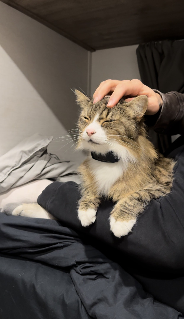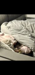 He loves to cuddle. He comes and climbs in under the blanket and snuggles right up against you and puts his head on your arm and he’s really good at catching things.
