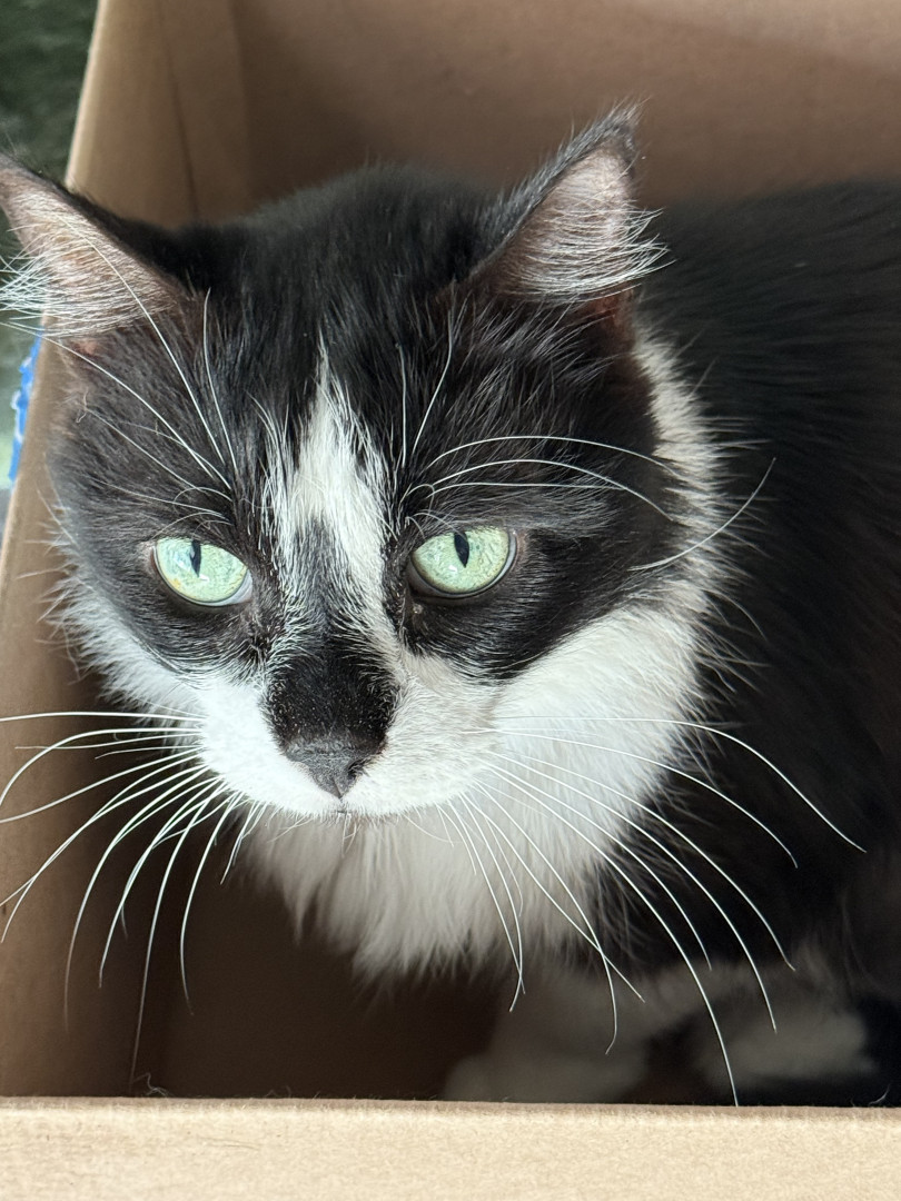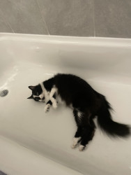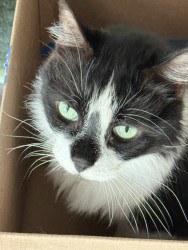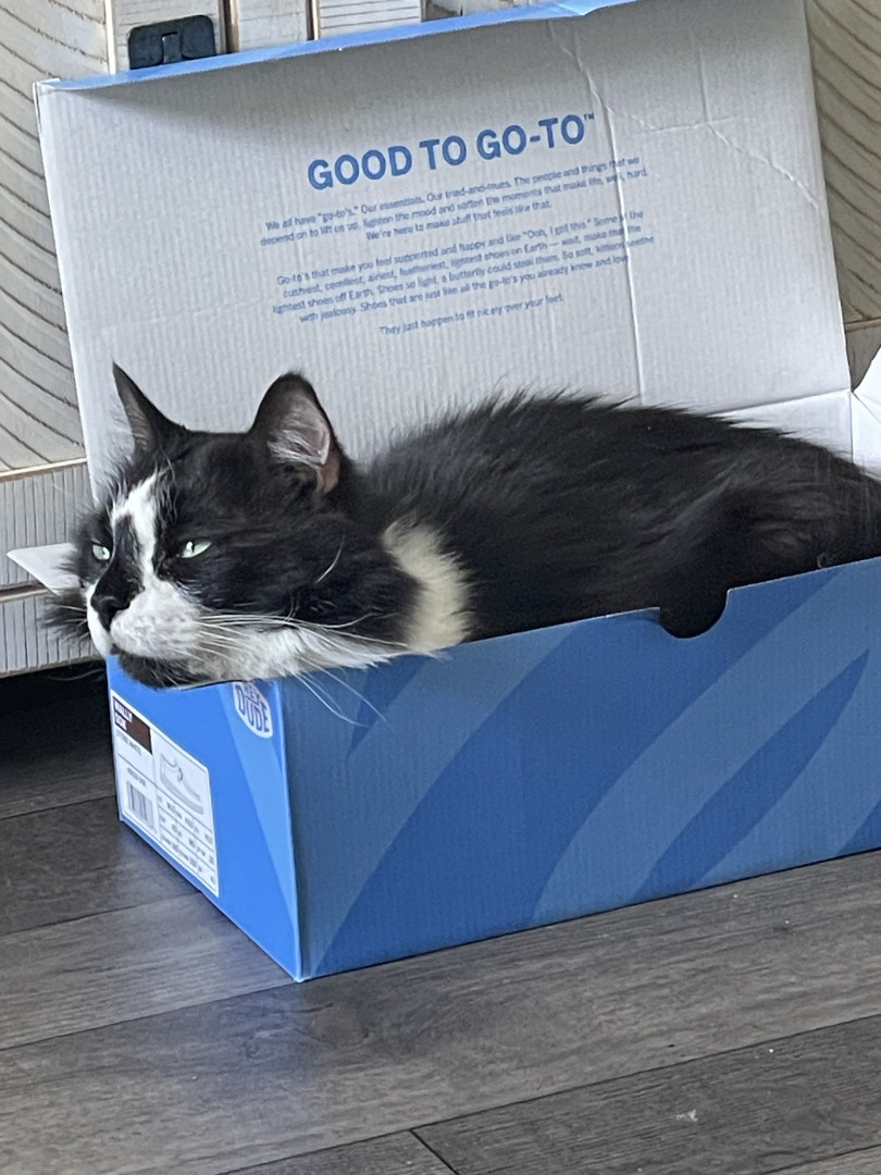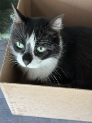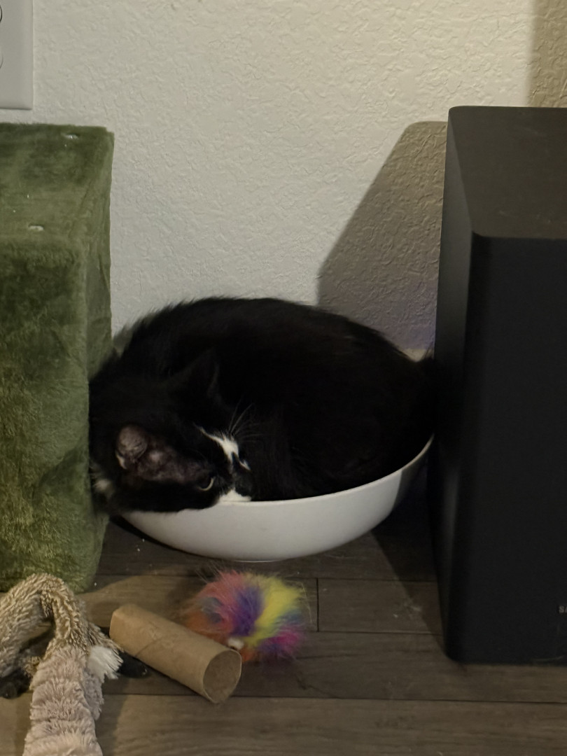 He will try to fit in any size box or bowl when he meows it’s a chirp.