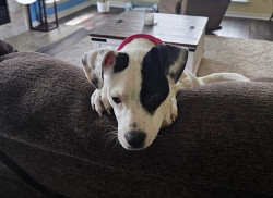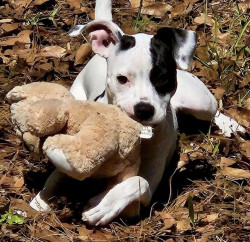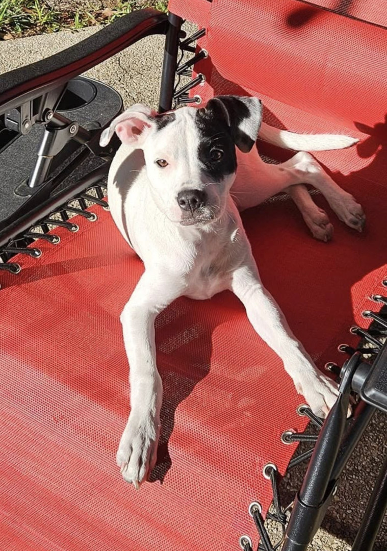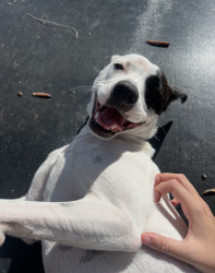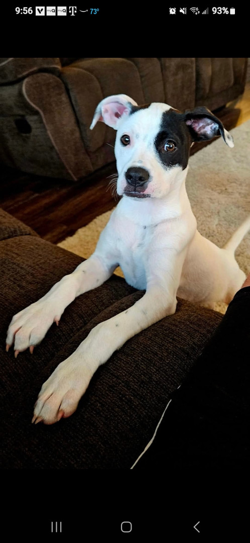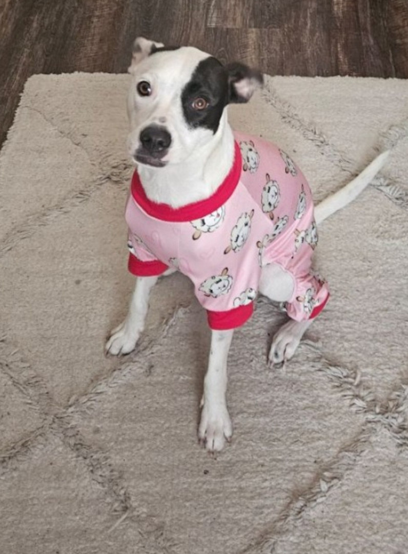 Sugar is a white and black terrier–pit bull mix with a huge personality and a loving heart. She’s playful, vocal, loyal and funny!