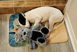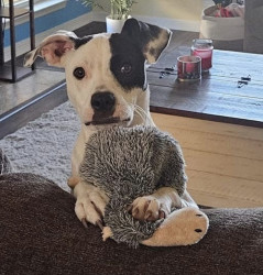Learn MoreSugar’s favorite “toy” is the window—it’s her squirrel surveillance station. She takes her job very seriously, staring out all day until a squirrel appears, then bursting out the doggie door like a professional hunter on duty. She’s already caught two squirrels this year and clearly believes she deserves a reward afterward. Any treat tastes better when it’s earned after a long day of protecting the yard.