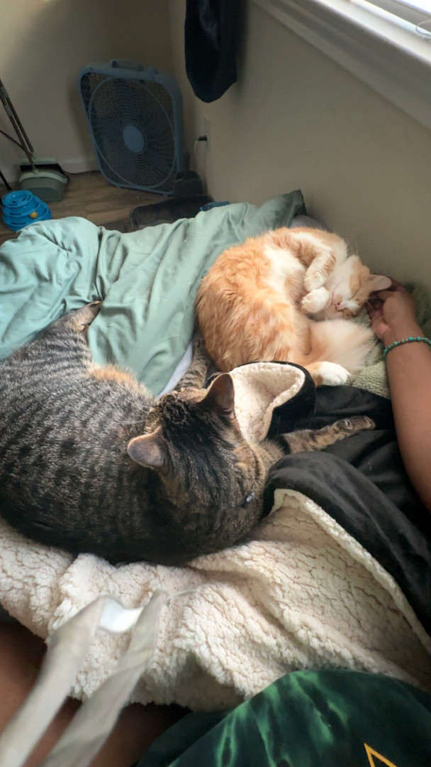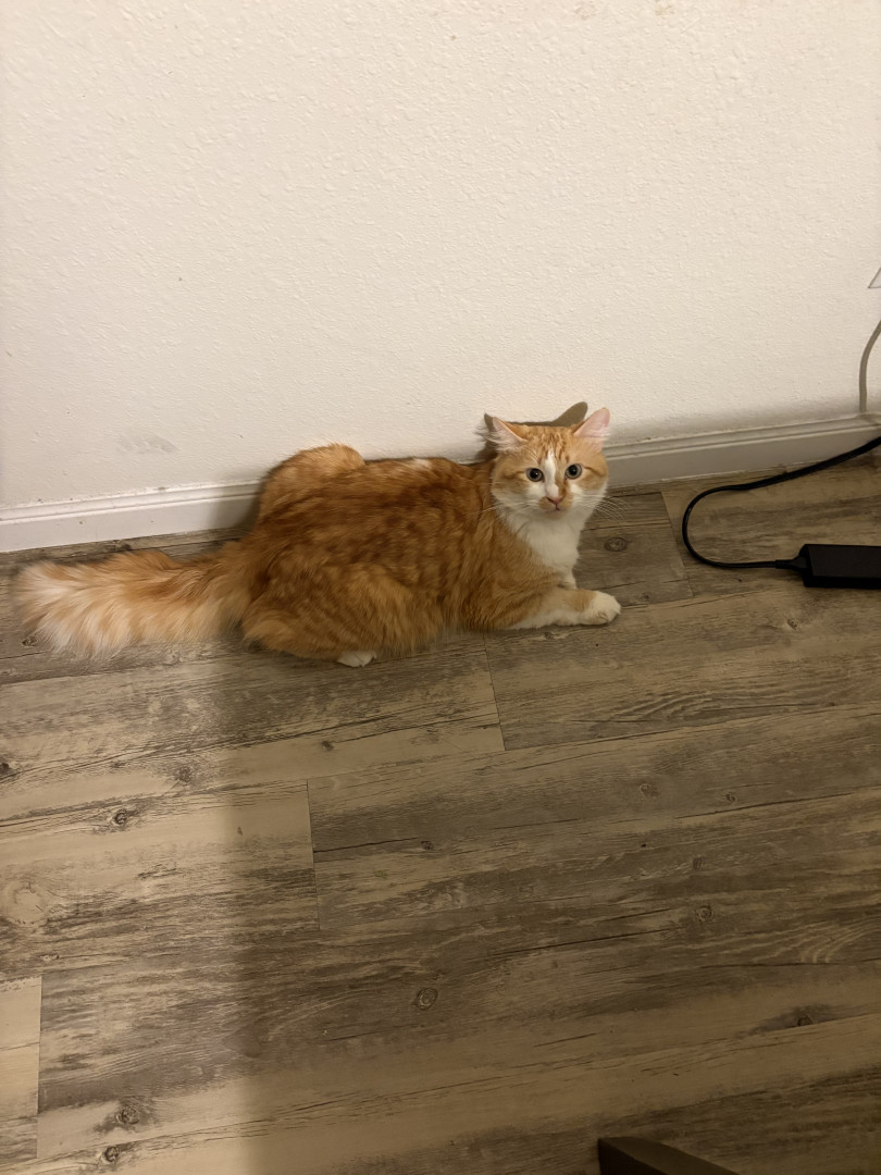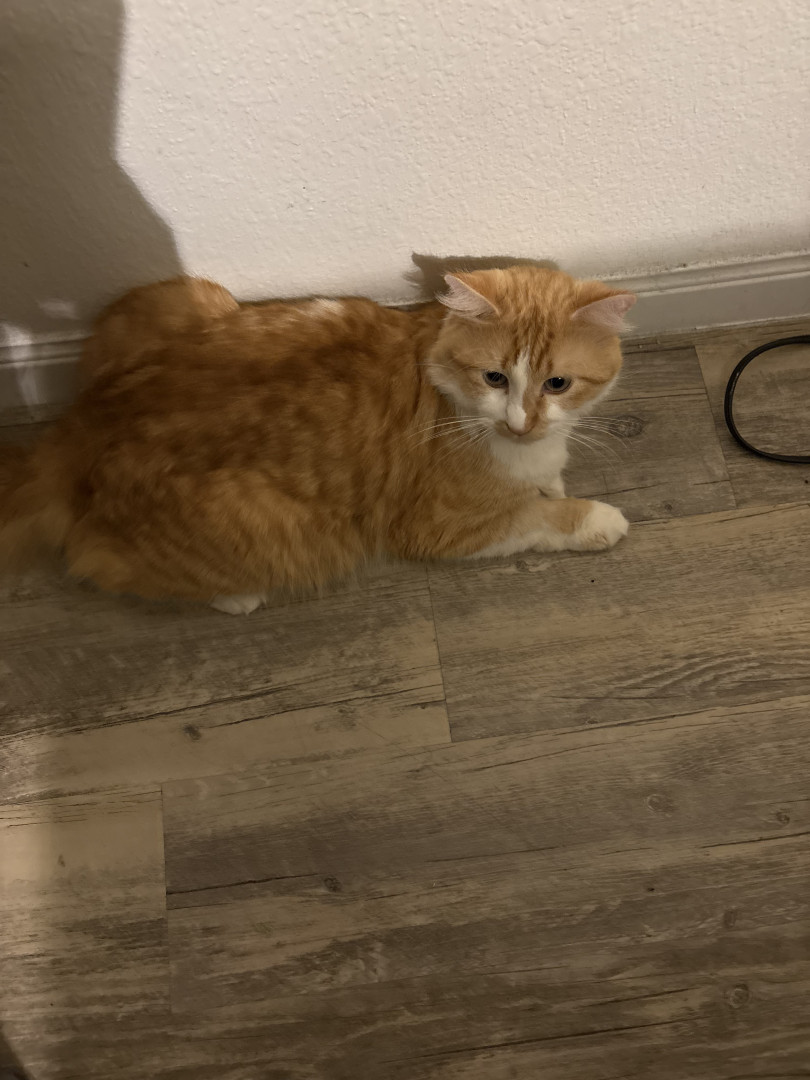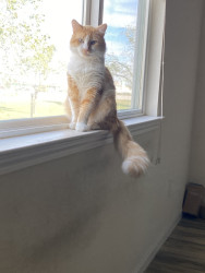 Sunni is a shy, loving cat. He loves to cuddle so he can typically be found in my bed. He’s very fluffy and soft.