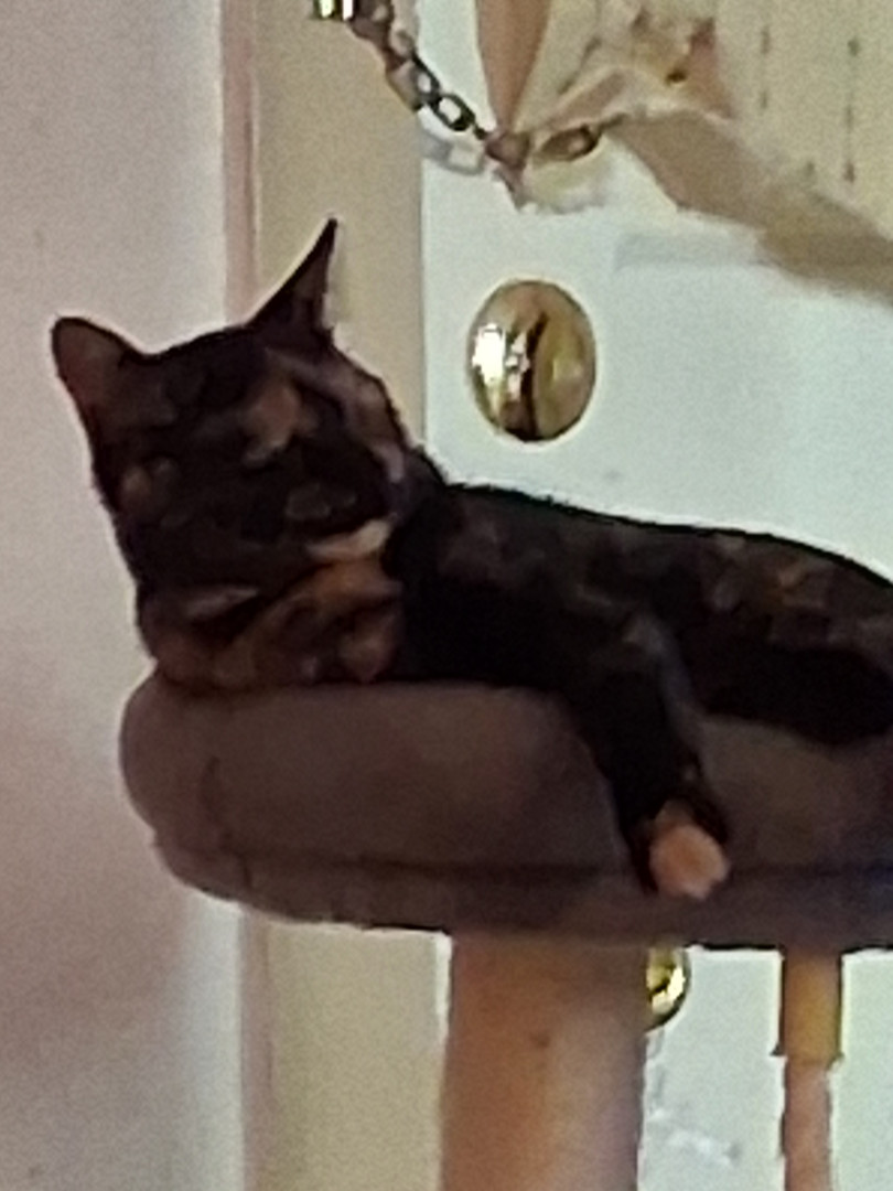 She is a calico with 6 different colors and half way down her tail about a 2 inch spot is very light gray and red the red like a red pandas color I named her sunny because the orange around her eyes is crazy like sun rays