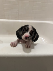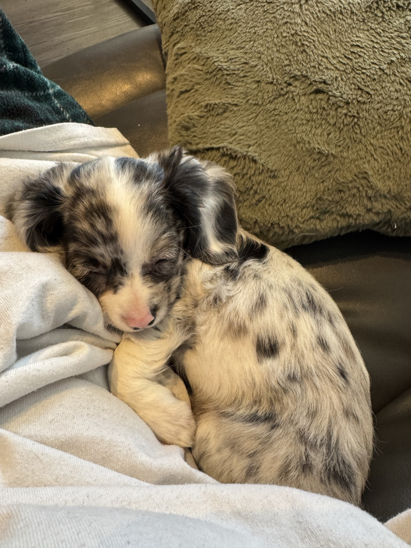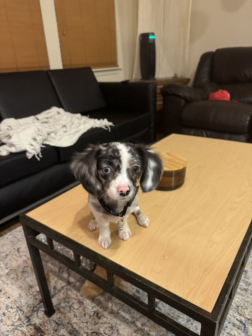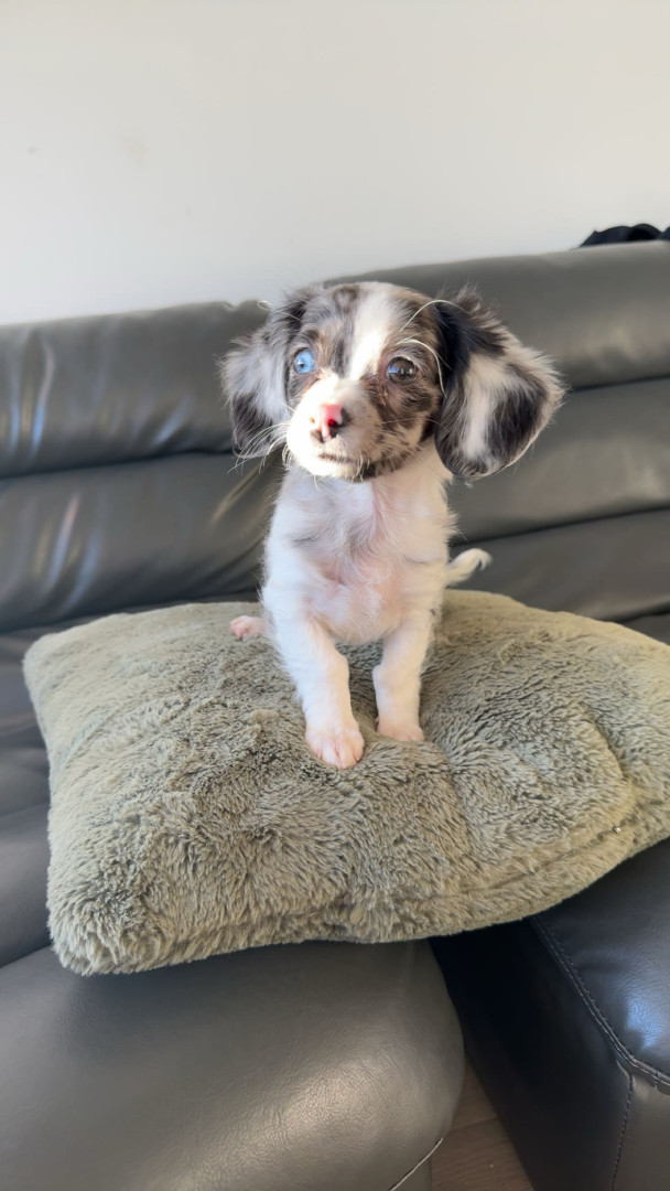 Mixed with Pomeranian, chihuahua, and wiener dog, or as we like to call it, a chiwieneranian! One brown eye and one blue eye