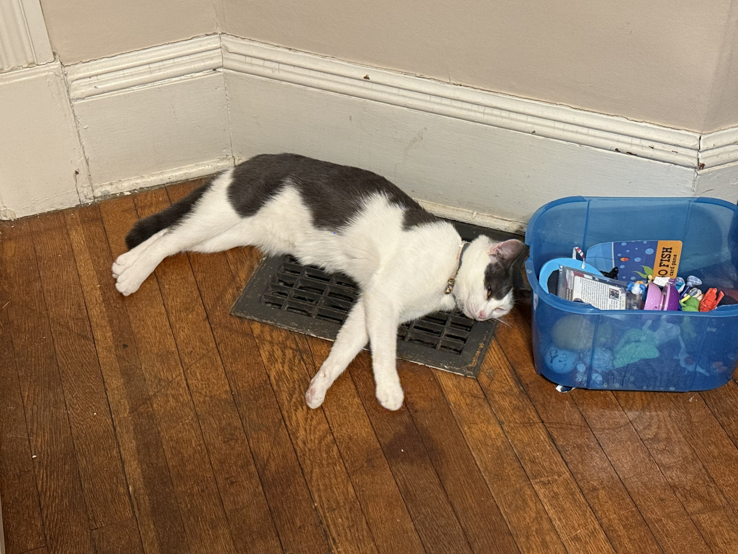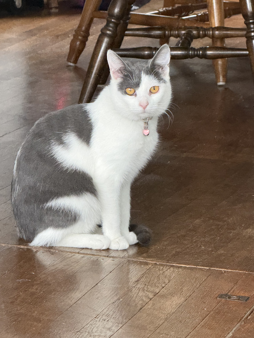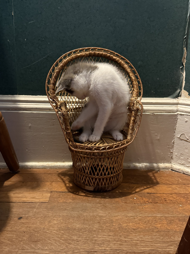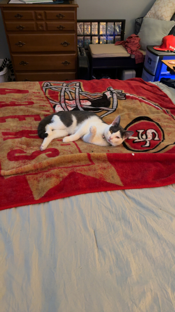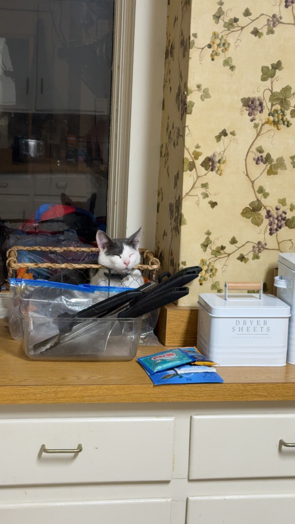 Sweet Sweet has come such a long way! She was found under a pine tree, covered in sap with her siblings. They didn’t have much of a chance, but got taken in, cleaned up, and vetted! A few of her siblings ended up losing an eye, but Sweet Sweet has truly persevered! She’s sweeter than sugar!! She’s super playful and by your side wanting to know what you’re doing all the time!! Sometimes mischievous, but very graceful! She loves to explore small spaces and absolutely loves her cat tunnels!!