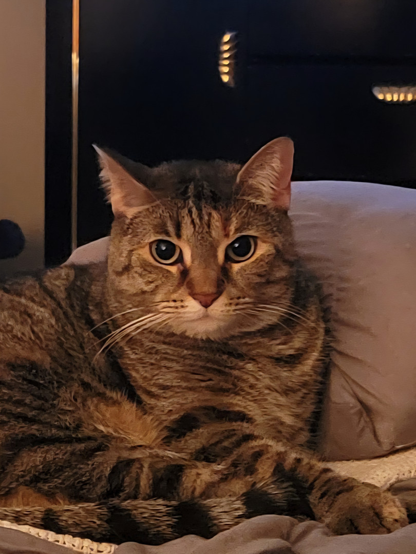 Symphony is a lovely cat who enjoys playing fetch, listening to music, and relaxing with me.