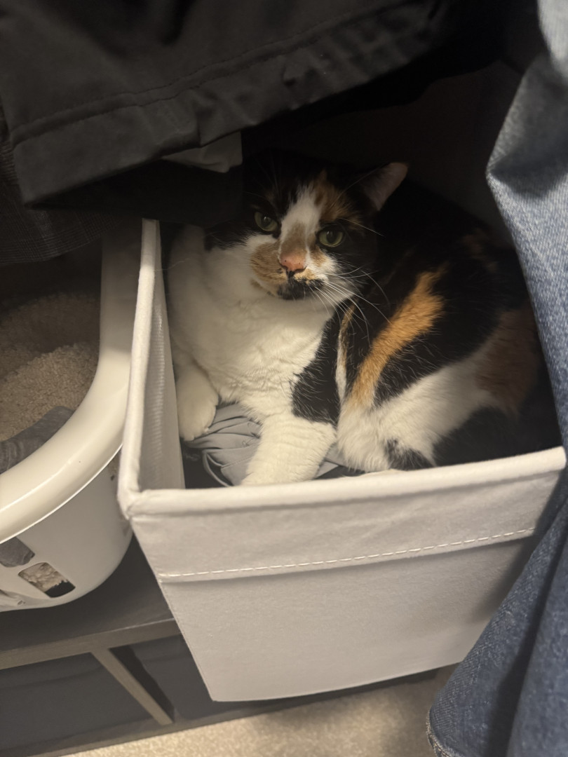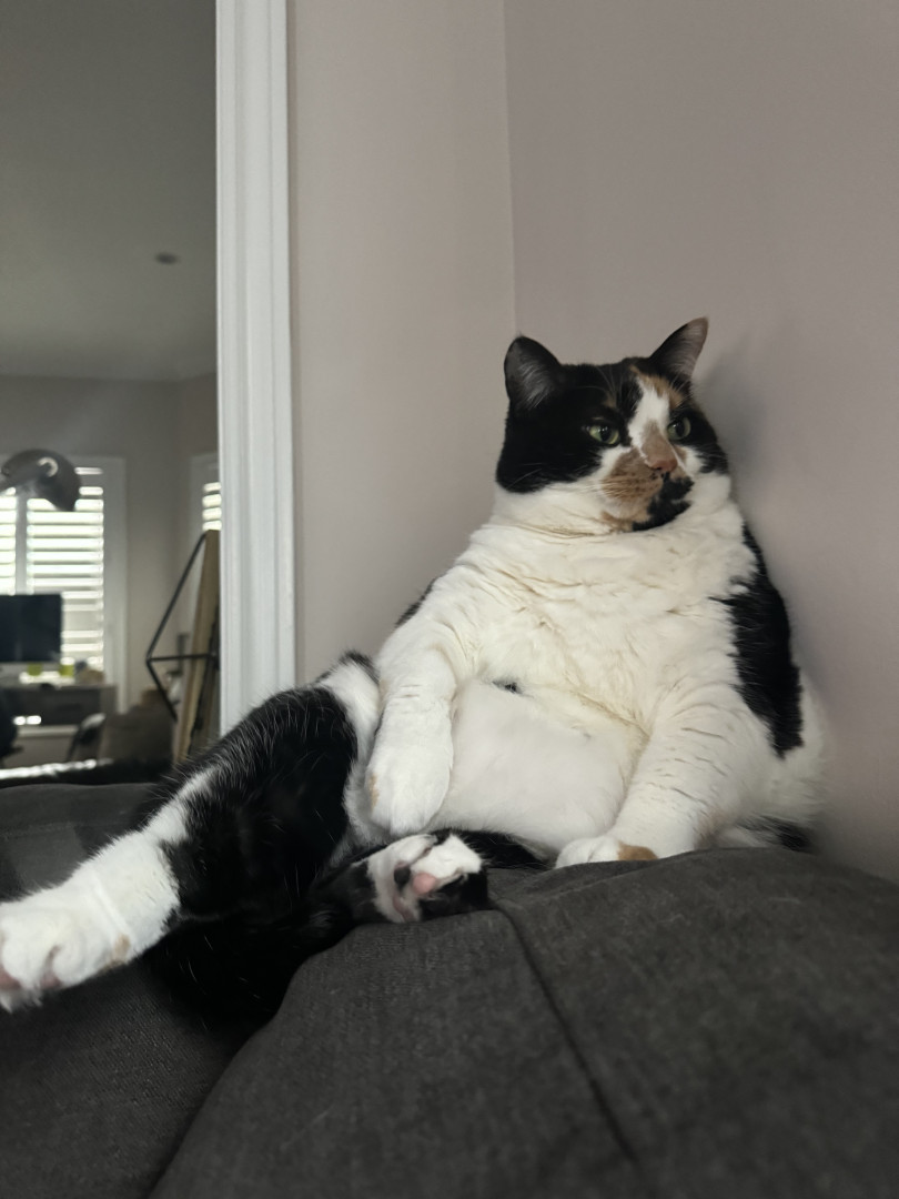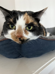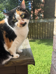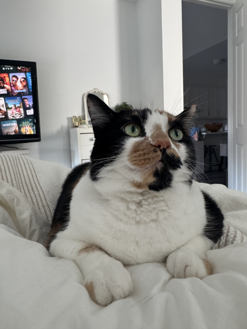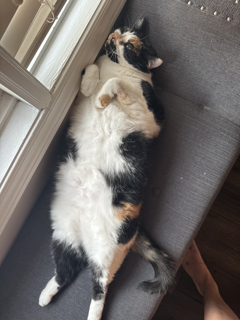 Tacocat is a spirited calico cat born in a barn north of Toronto. Her palindrome name mirrors her quirky charm! She saved my life.