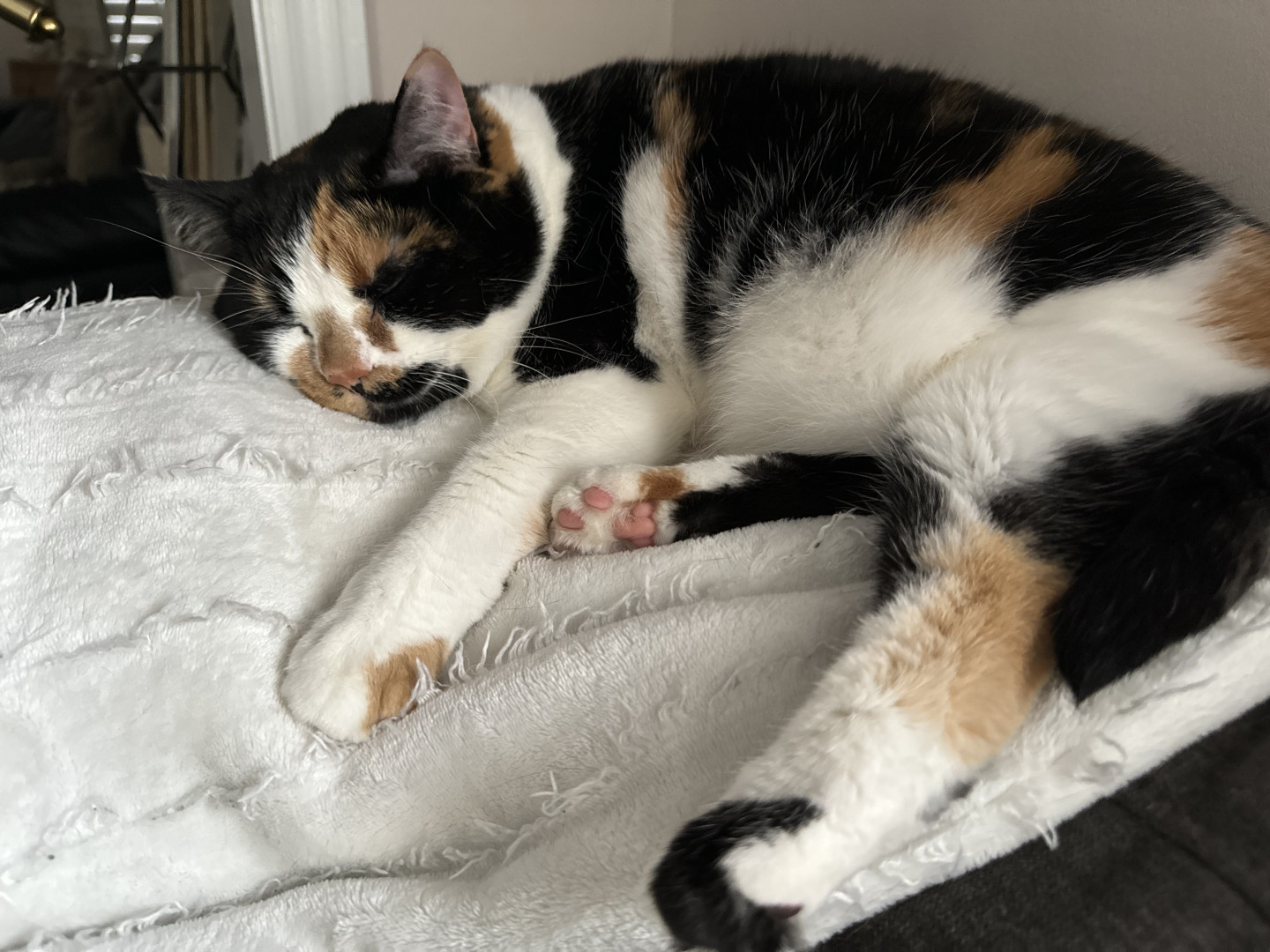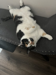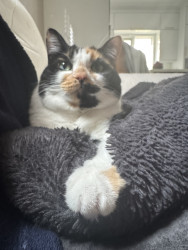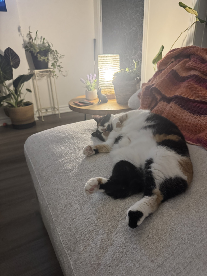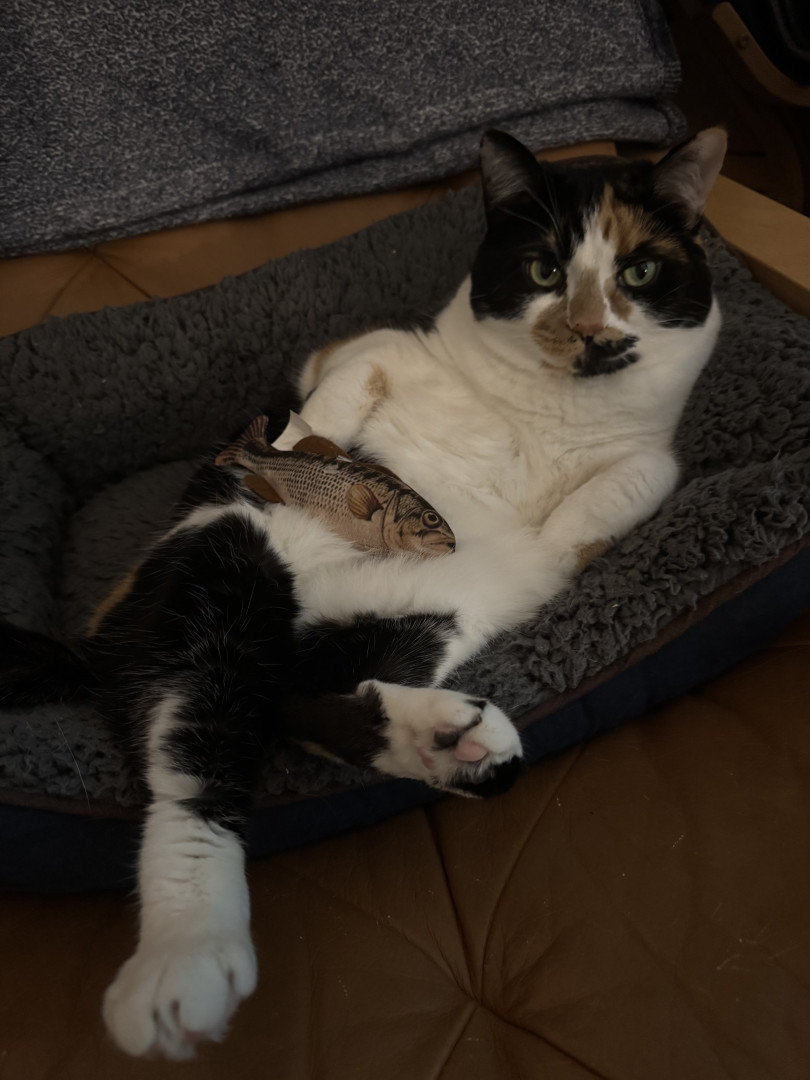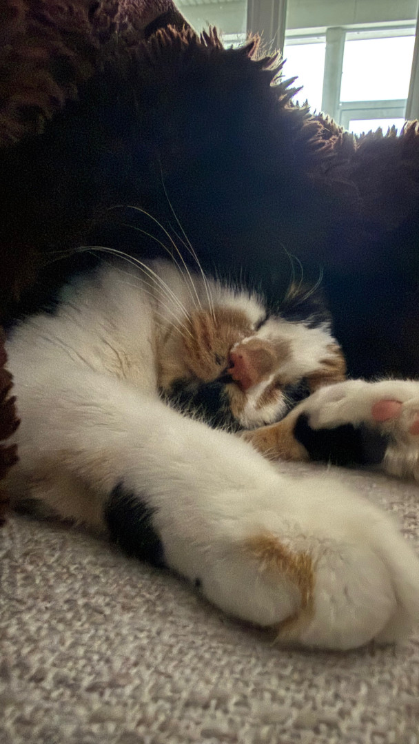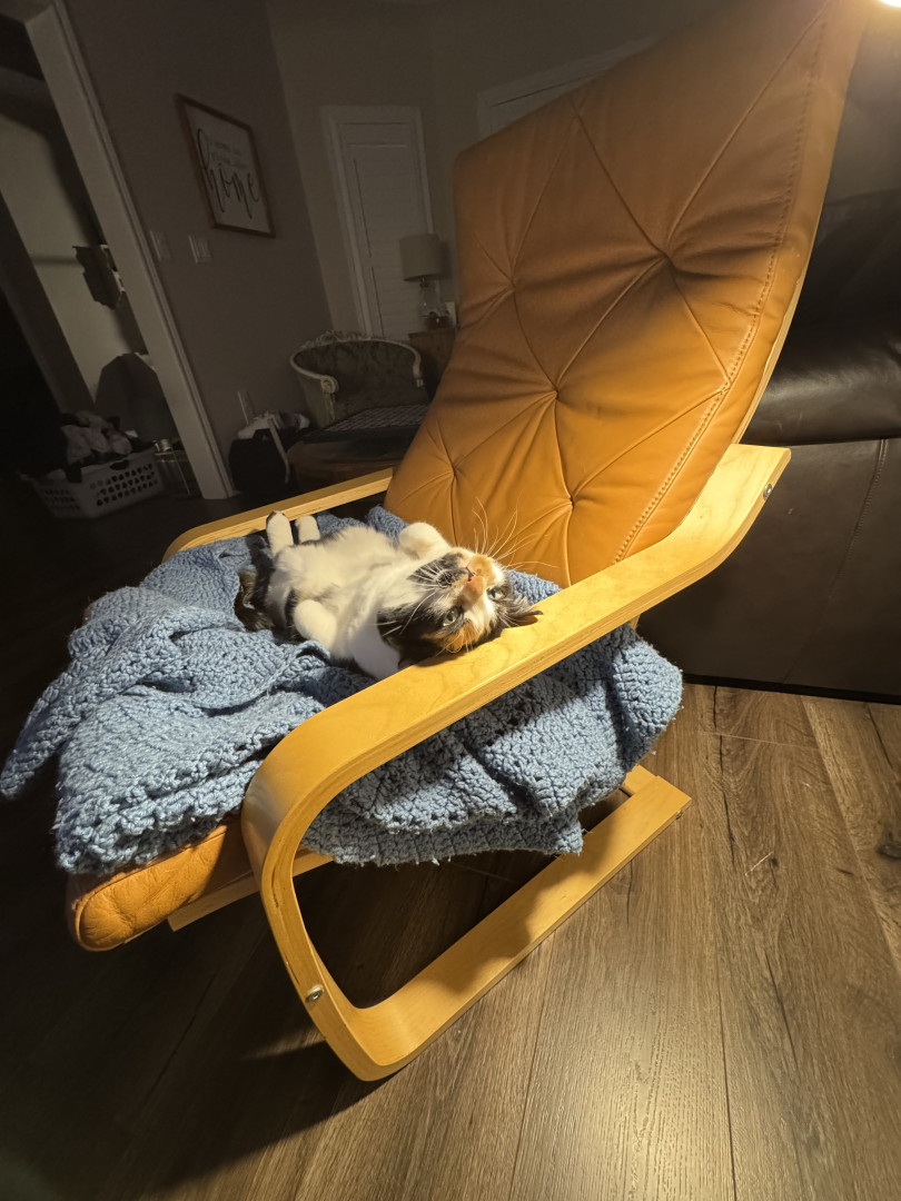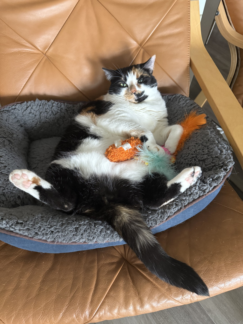 Receive Text UpdatesTacocat adores her colorful feather wands—she bats at the yellow, purple, and blue ones with endless energy, often hugging them close like in her photos. She also loves plush toys, from her big brown bear for snuggling to the spotted giraffe and springy coils for pouncing. Her go-to treat is freeze-dried tuna bites, which she meows excitedly for every time!
