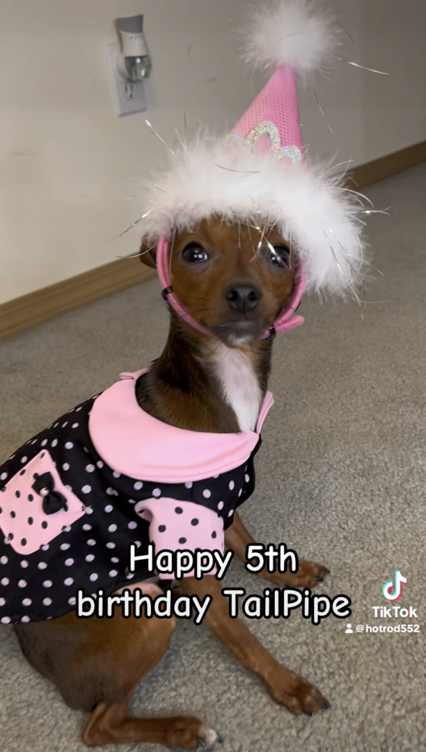 TailPipe’s most unique quality is her always present Mohawk. She was born with it and it’s always standing up! See photos