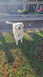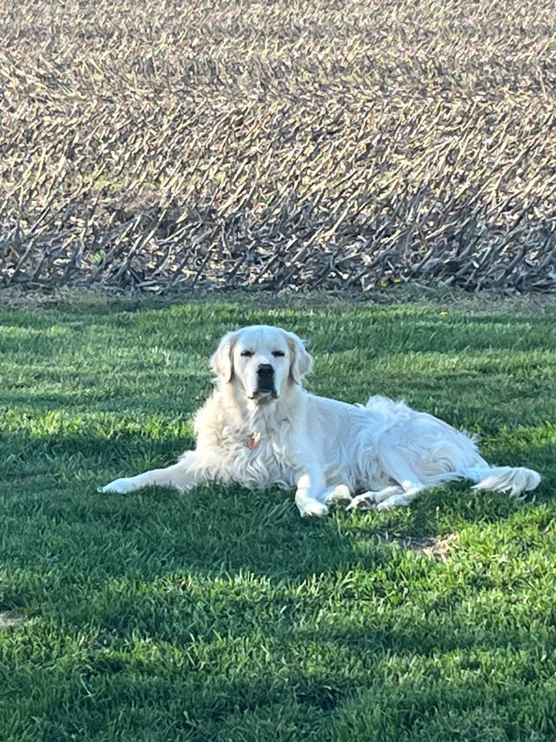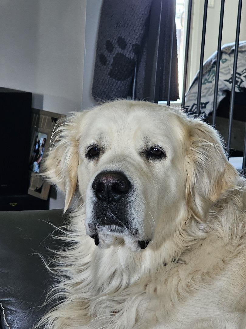 He is such a lover boy. Thinks he is a lap dog even though he weighs 114 lbs. He's just the best dog. I have 5 other Goldens but he the stamd out.