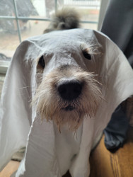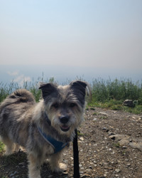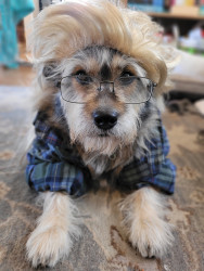 Tanner is a busy body. He loves spying on neighbors, peeking into windows or cars. He loves pizza, gentle pets, snow, and going shopping.