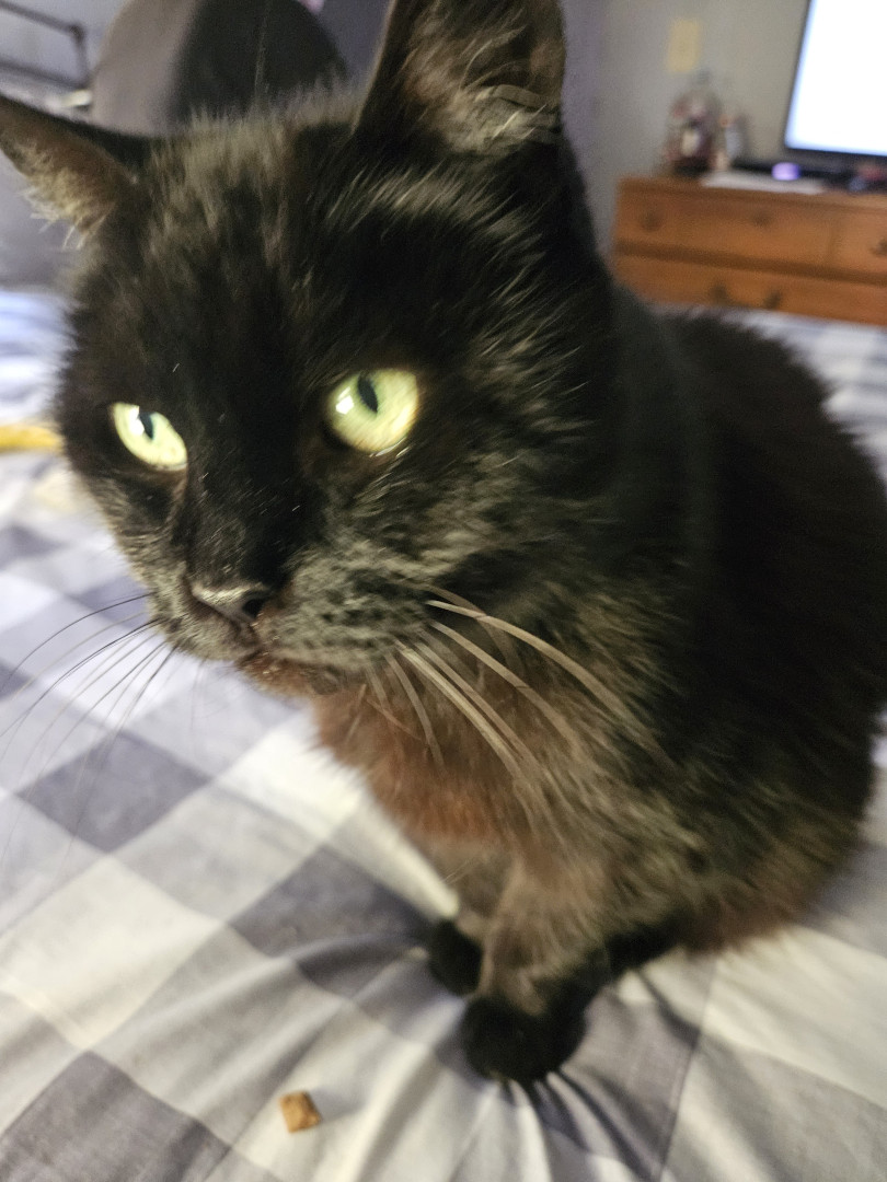 She was rescued and didn't really like people. But now she is a Diva and very demanding loves yo be petted the queen of the castle.